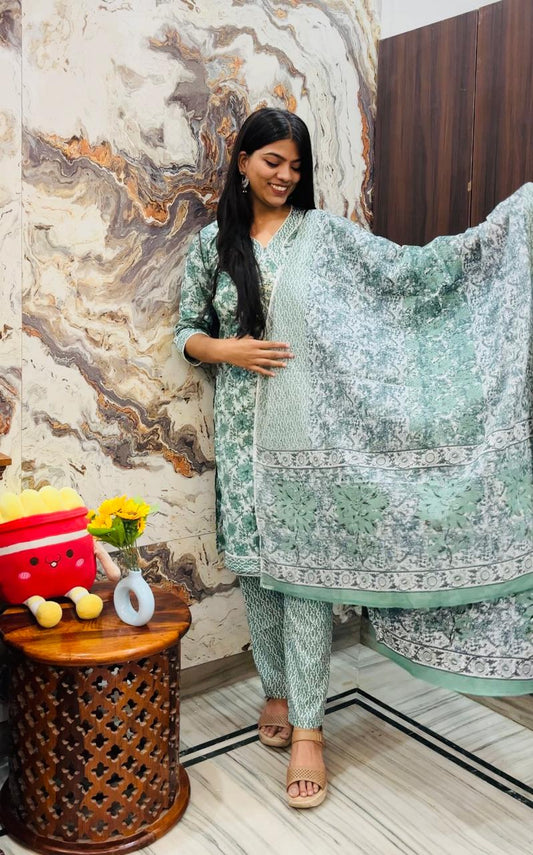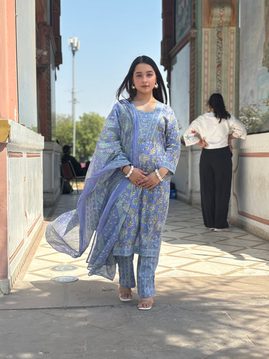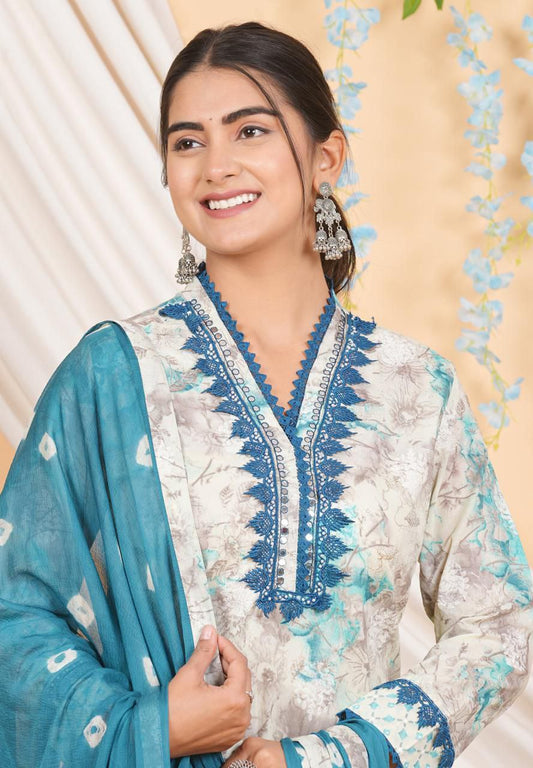 Elegant Navy Blue & Beige Floral Print Straight Kurta Set with Chiffon Dupatta