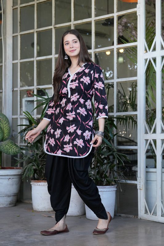 Fuchsia Pink Rayon Embellished Peplum Kurta with Lace-Trim Dhoti pants