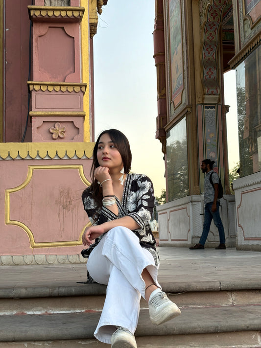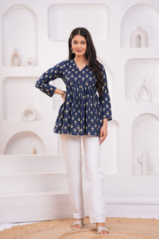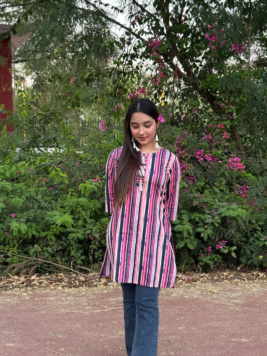 Amber Bloom Cotton Tunic with Mandarin Collar & Front Button Detailing