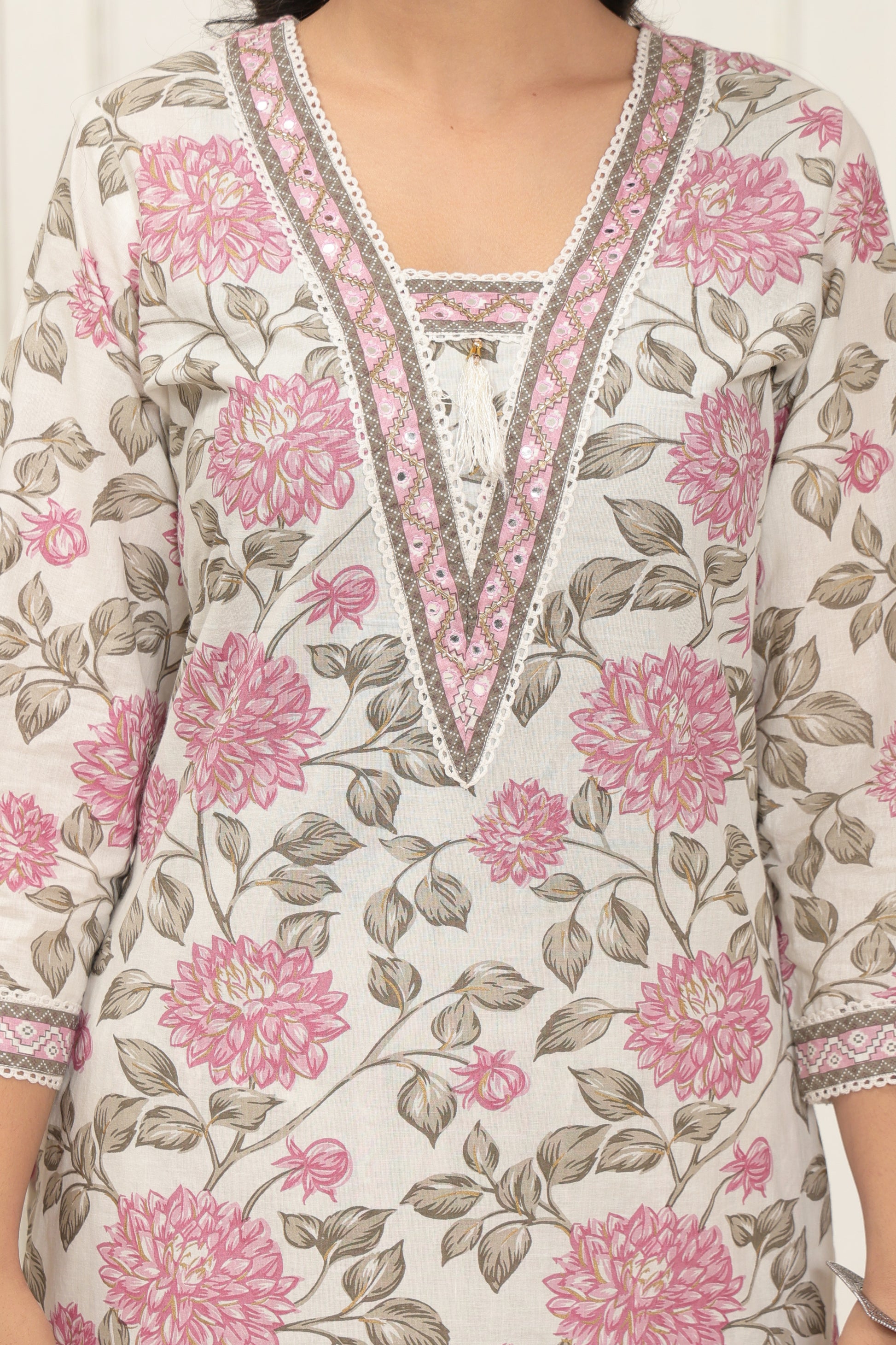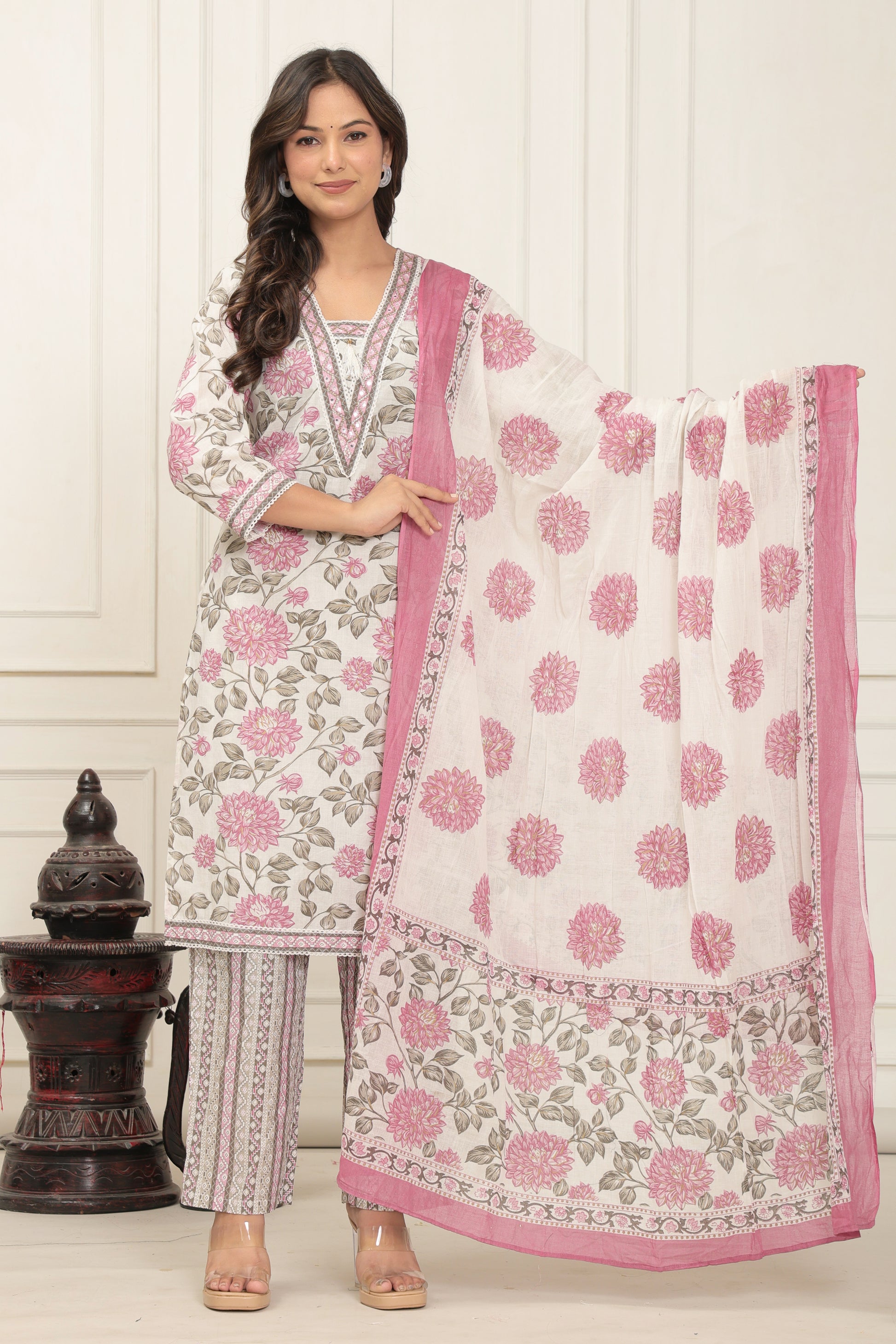 Elevate your ethnic wardrobe with the Aarika Women's Printed Cotton Suit Set, a graceful blend of comfort and elegance. Made from breathable, high-quality cotton fabric, this suit set features a stunning floral print in soft pink hues that exudes a timeless charm. The highlight is the delicate handwork detailing on the neckline, adding a touch of artisanal sophistication. Paired with a matching dupatta and printed bottoms, this ensemble is perfect for festive gatherings, casual outings, or a simple day out in style. Embrace tradition with a modern twist and make a memorable statement in every setting.