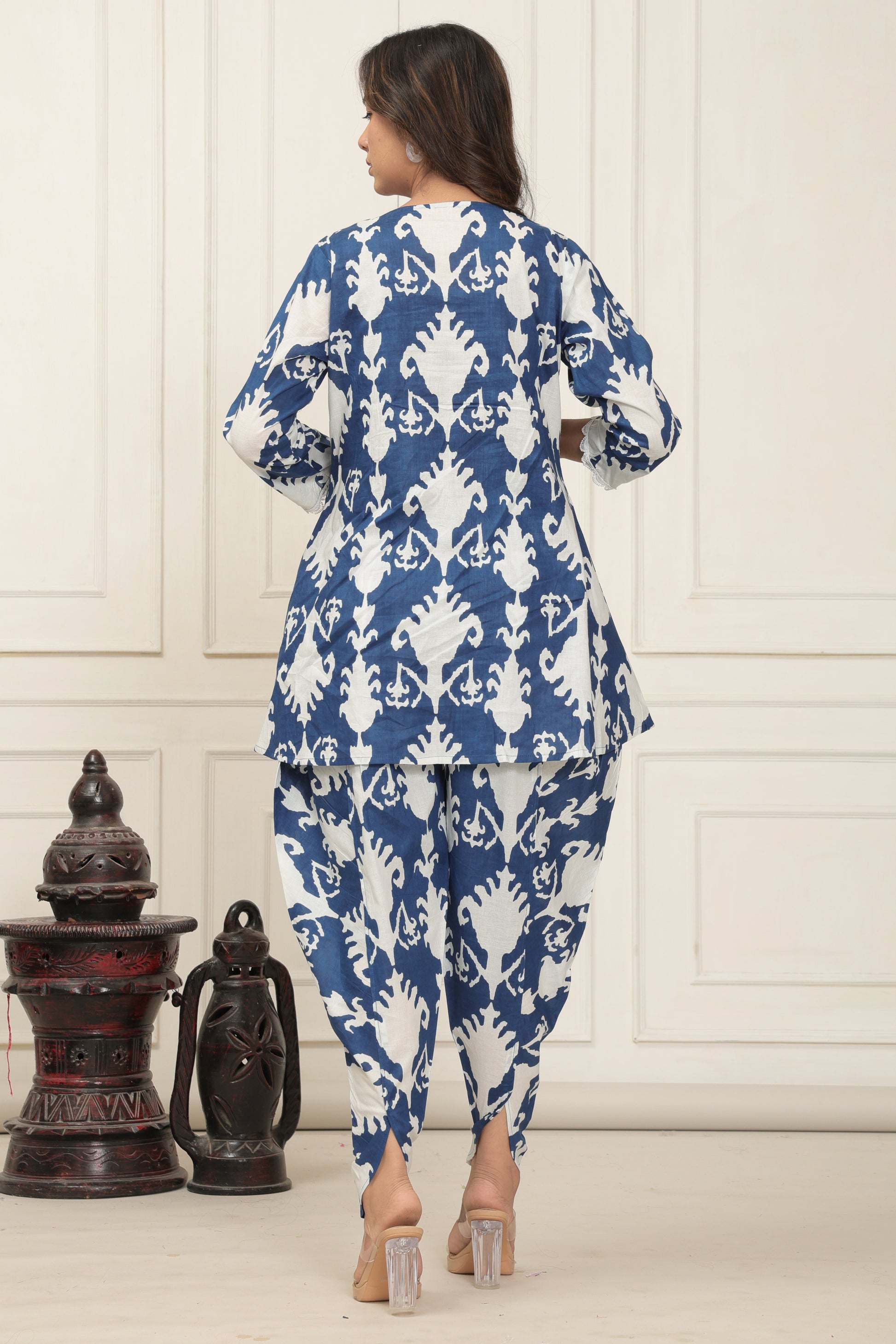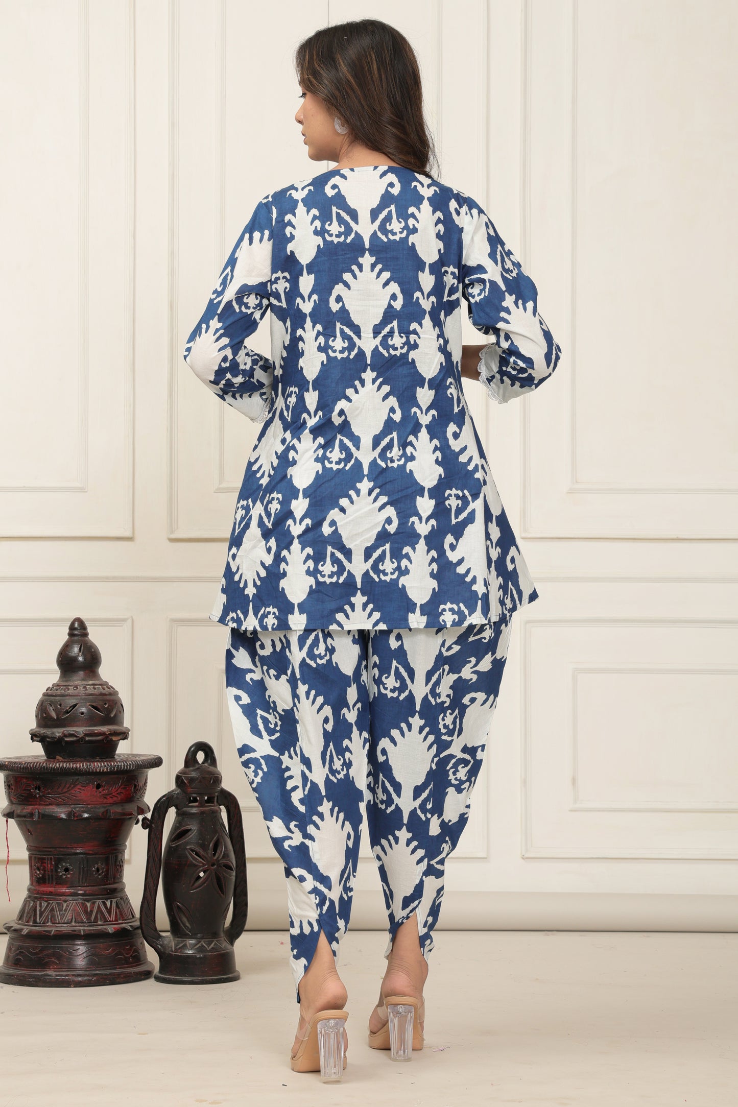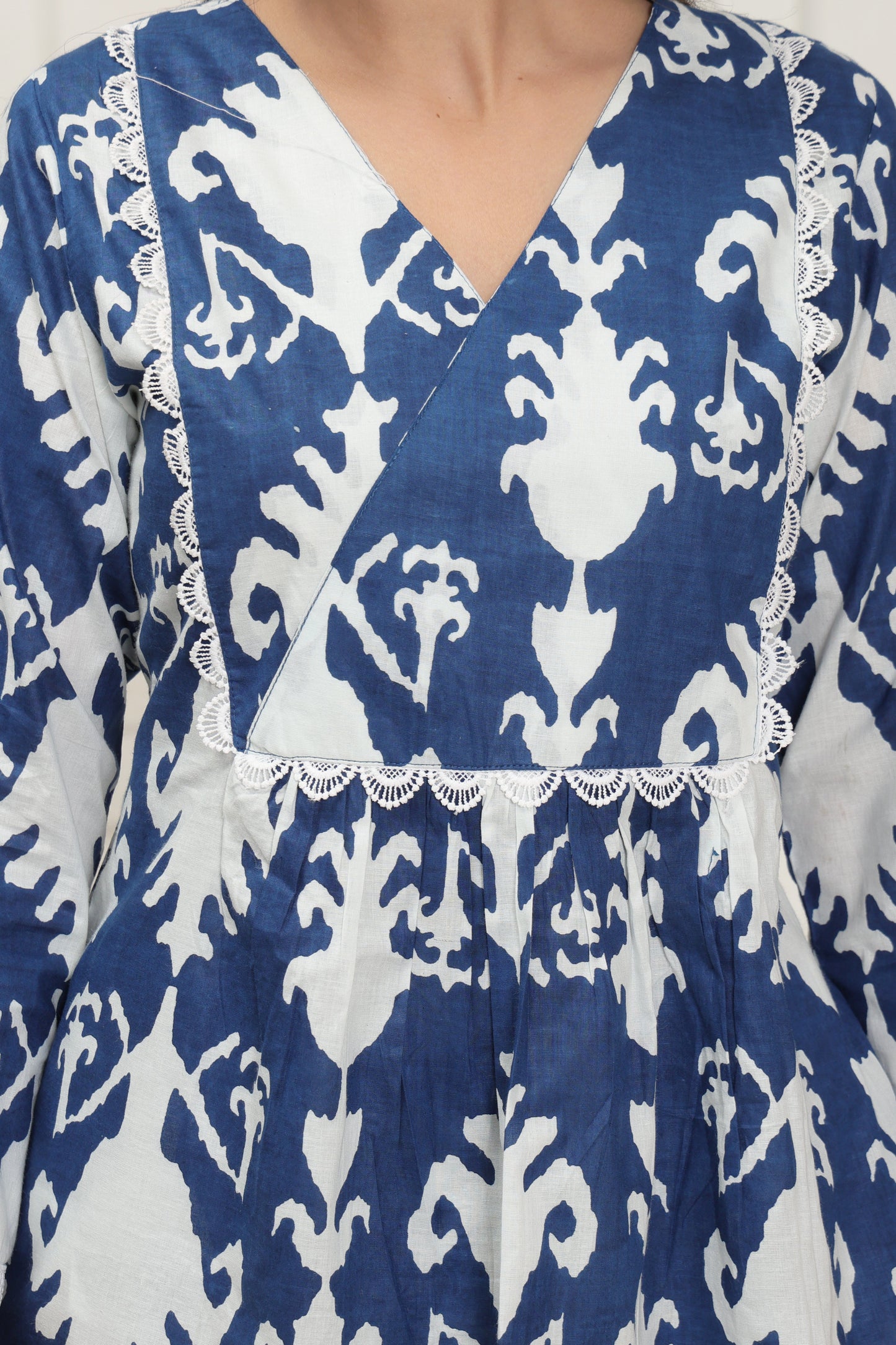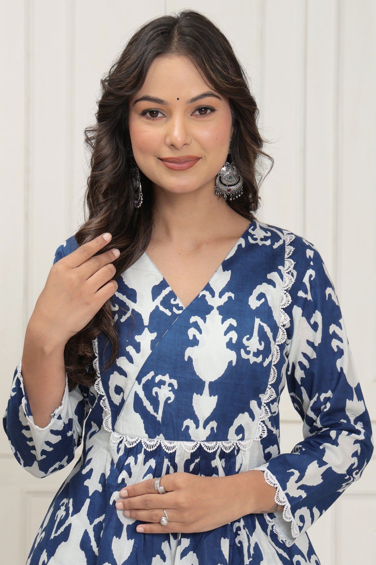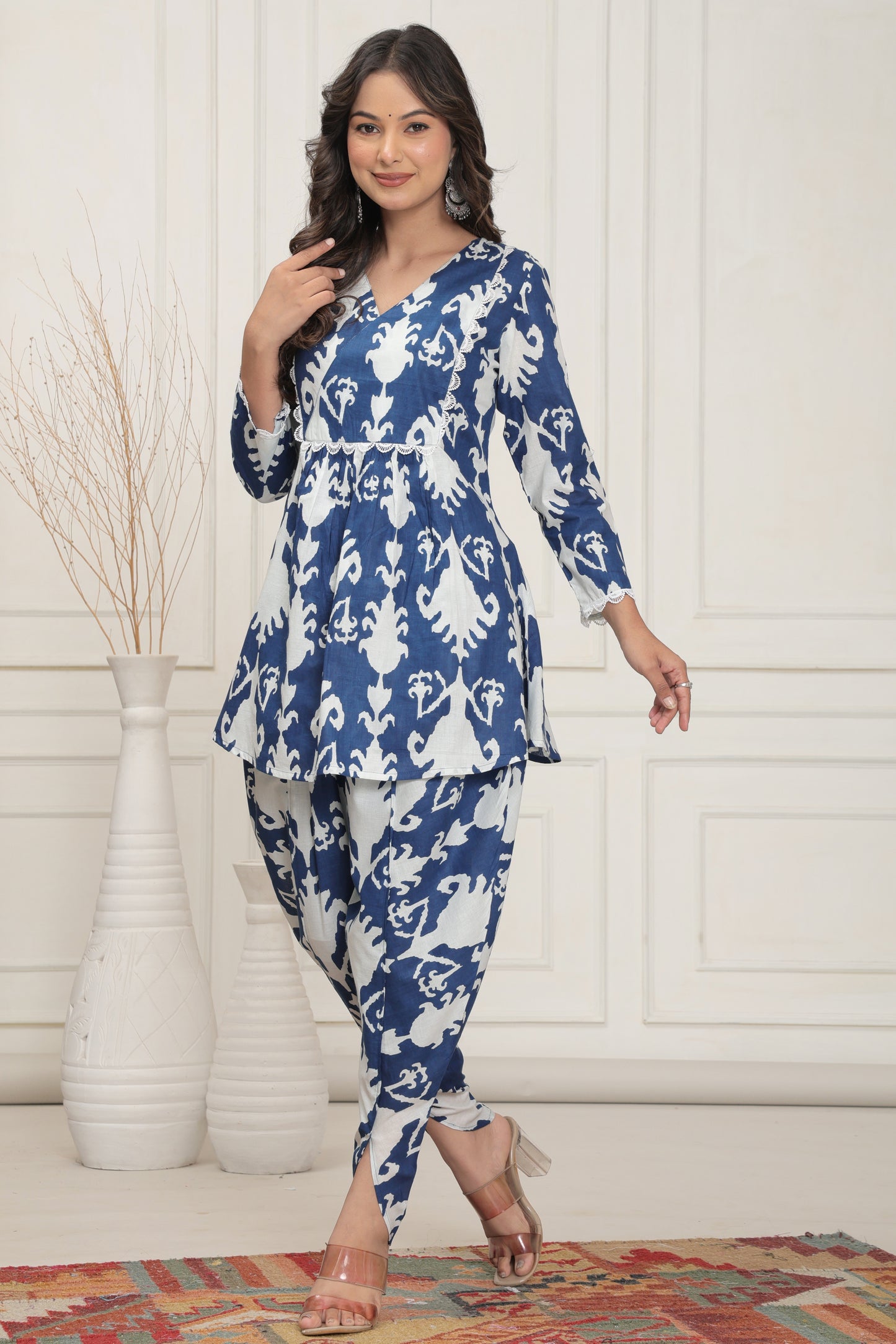 Ikat Blue Cotton Printed Co-Ord Set with Flared Kurta & Lace Yoke Detailing