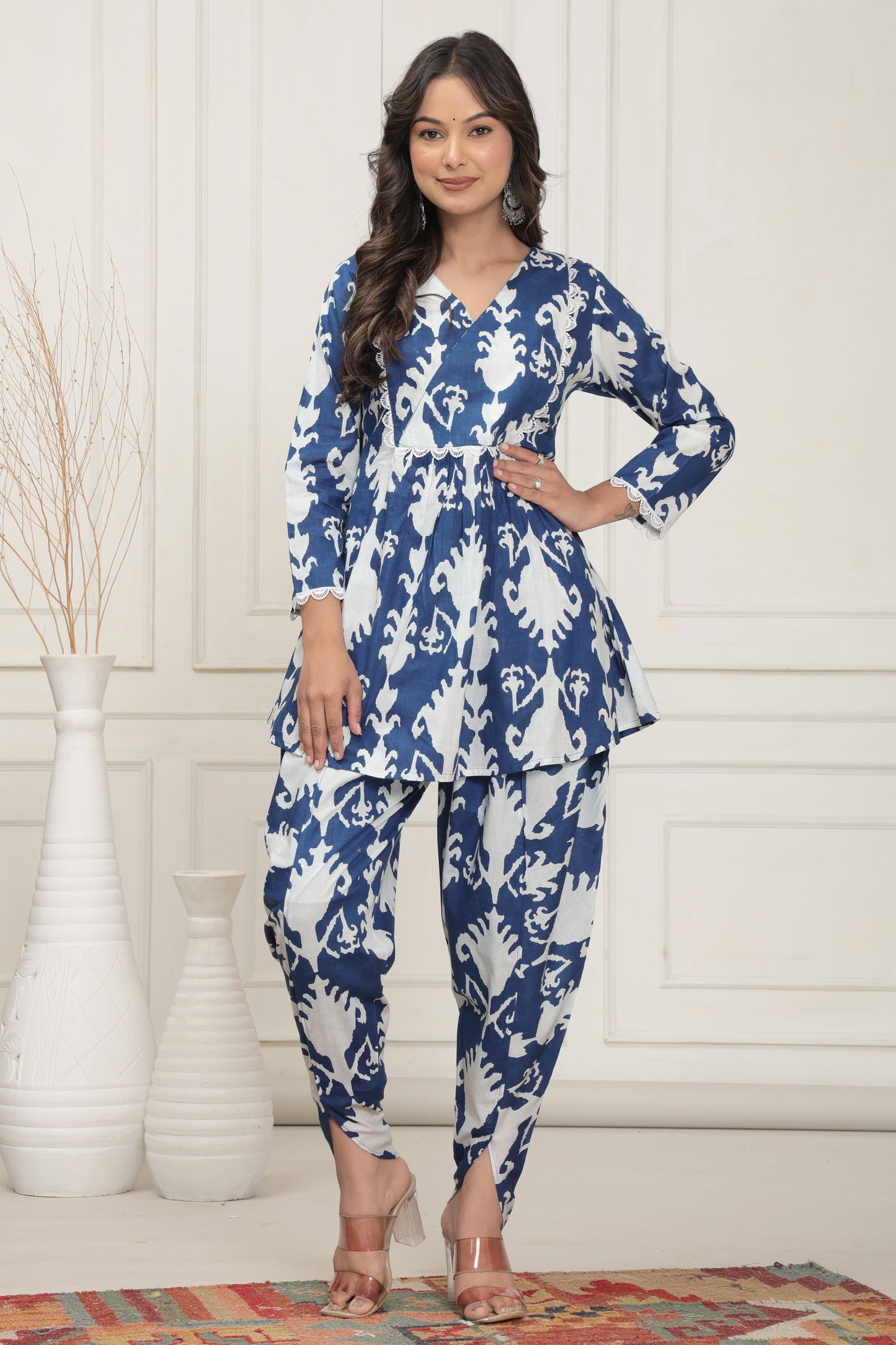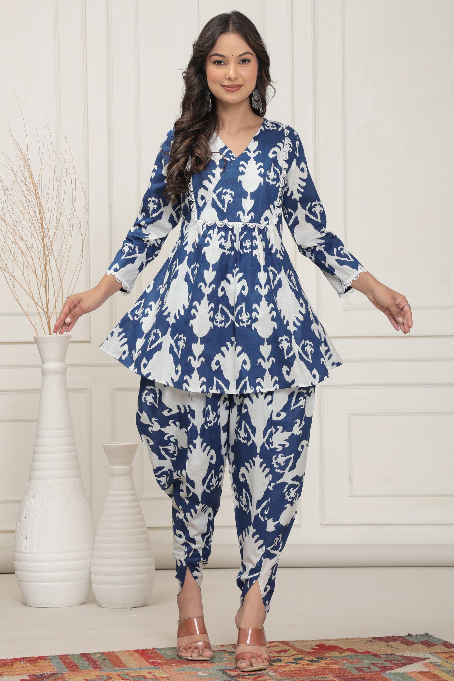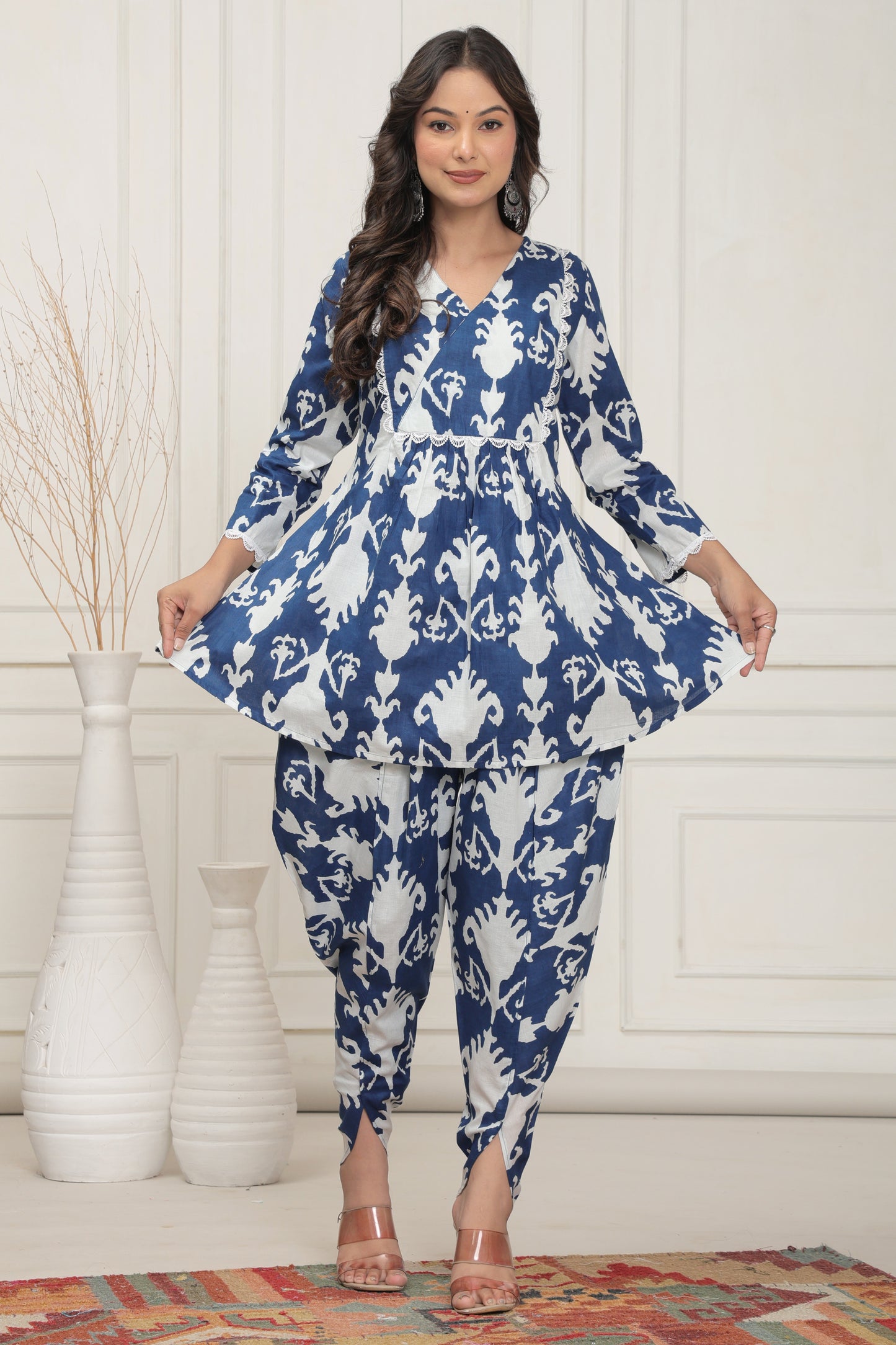 The top features a flared, peplum-style kurta in a stunning blue-and-white ethnic print, accentuated by delicate lace detailing on the yoke and sleeves. It pairs effortlessly with a stylish cotton dhoti pant — roomy, comfortable, and an instant fashion statement.