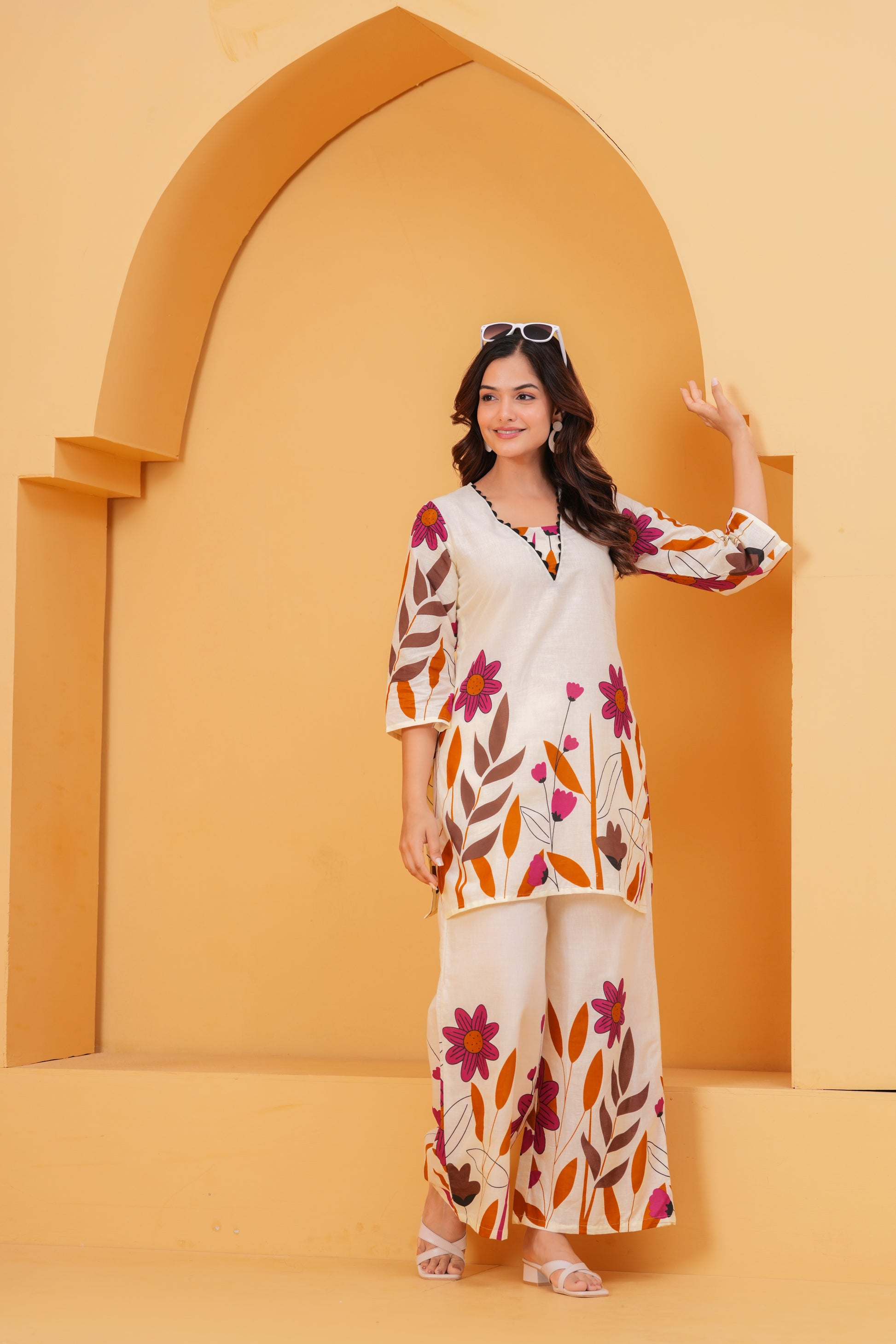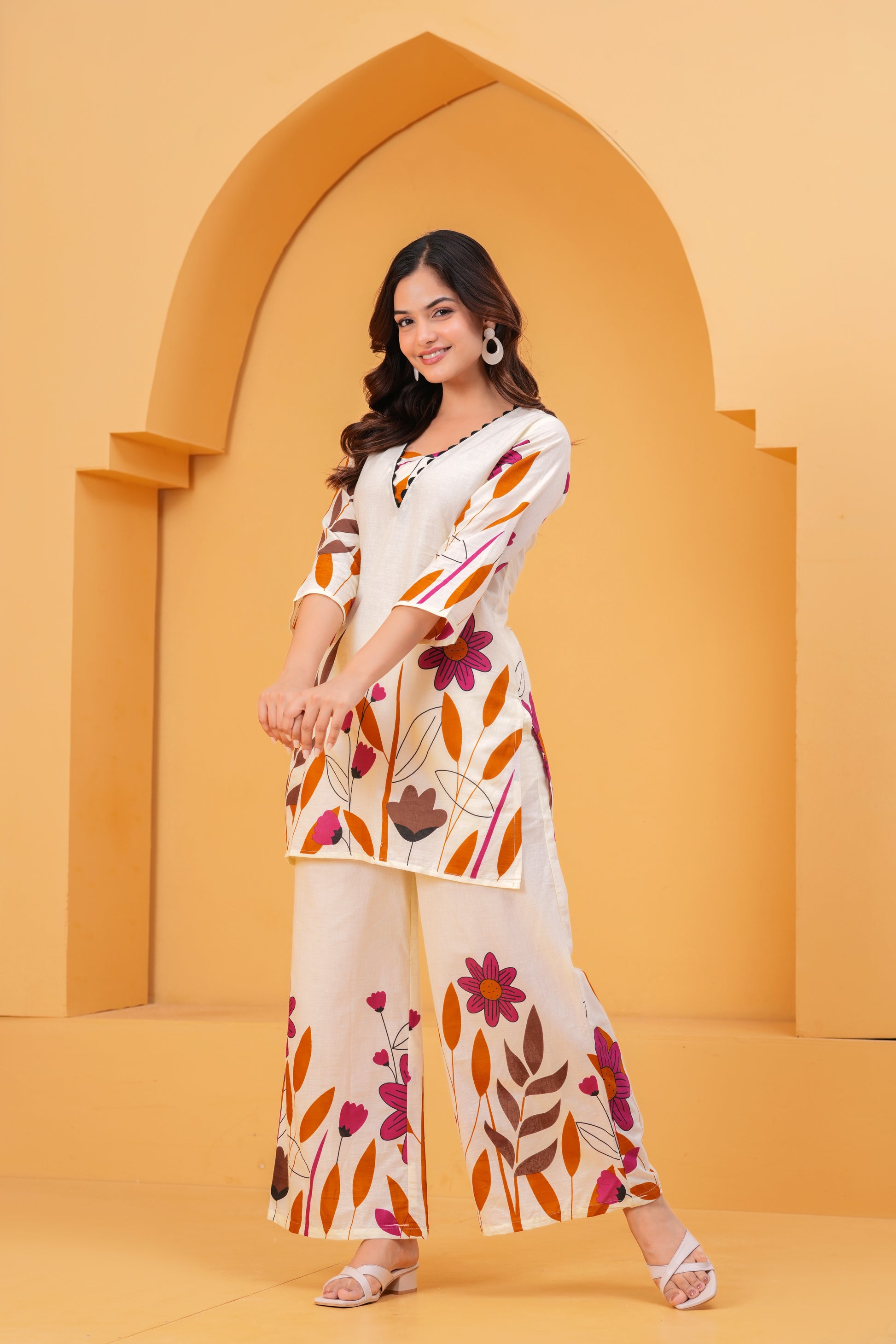 Paired with flowy wide-leg cotton pants that echo the same print story, this outfit is made for sunny brunches, festive days, or weekend getaways. Lightweight and breathable, it keeps you cool while making sure you look anything but ordinary.