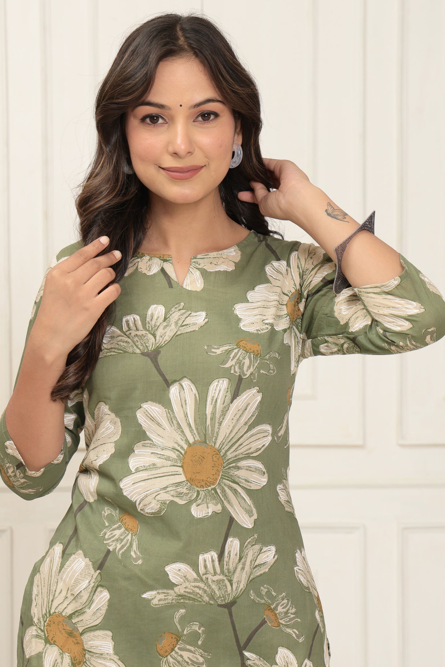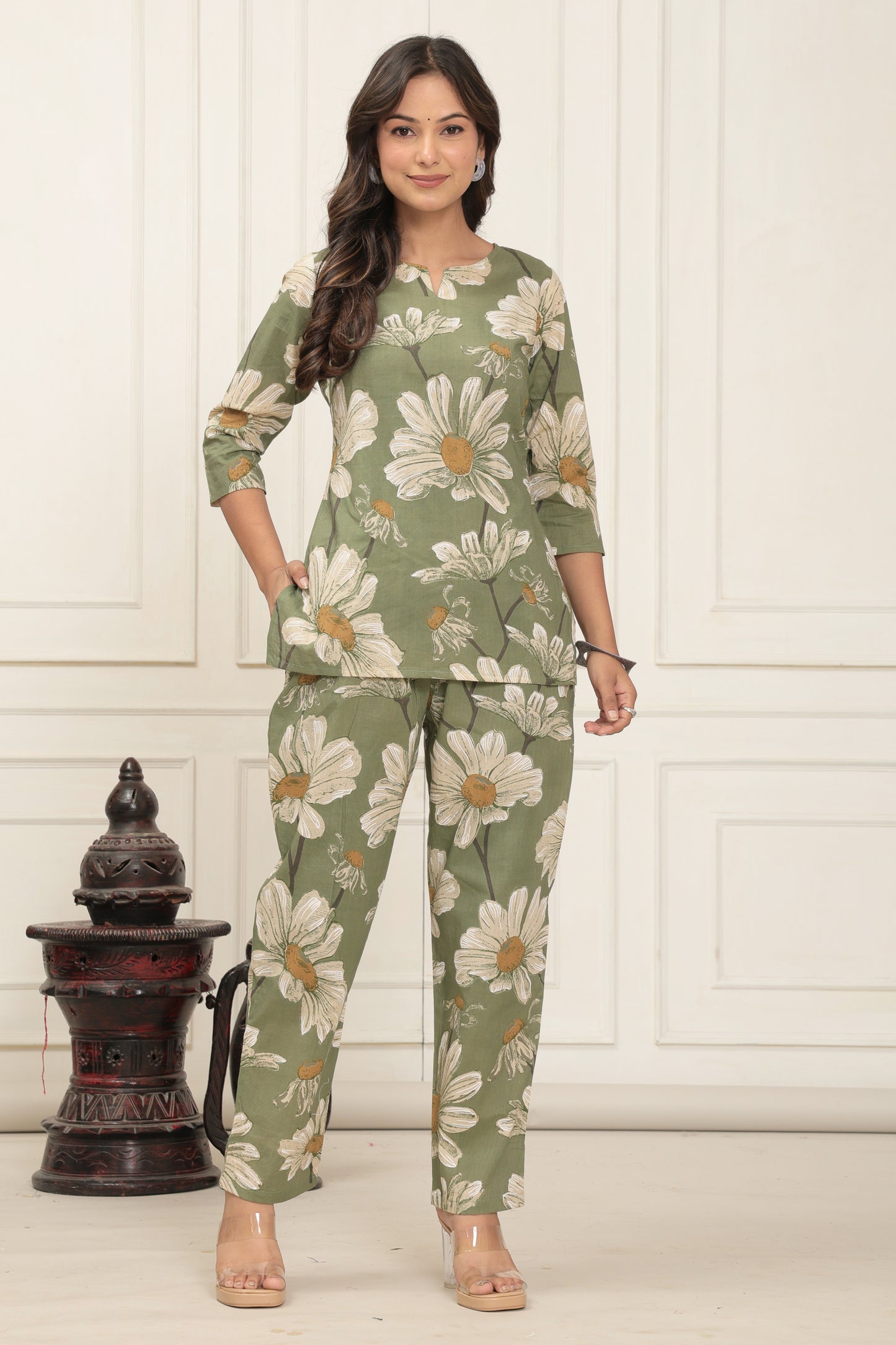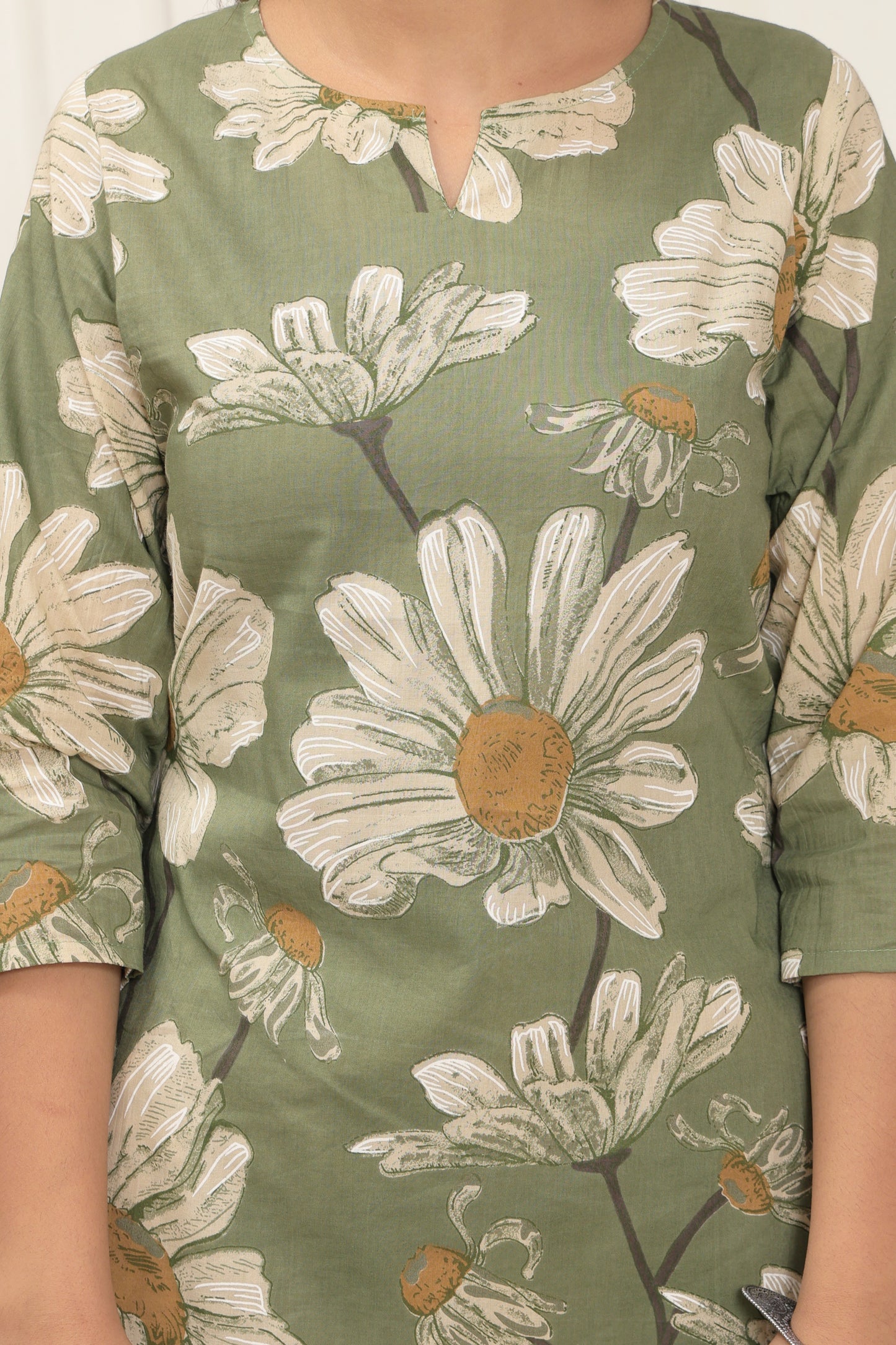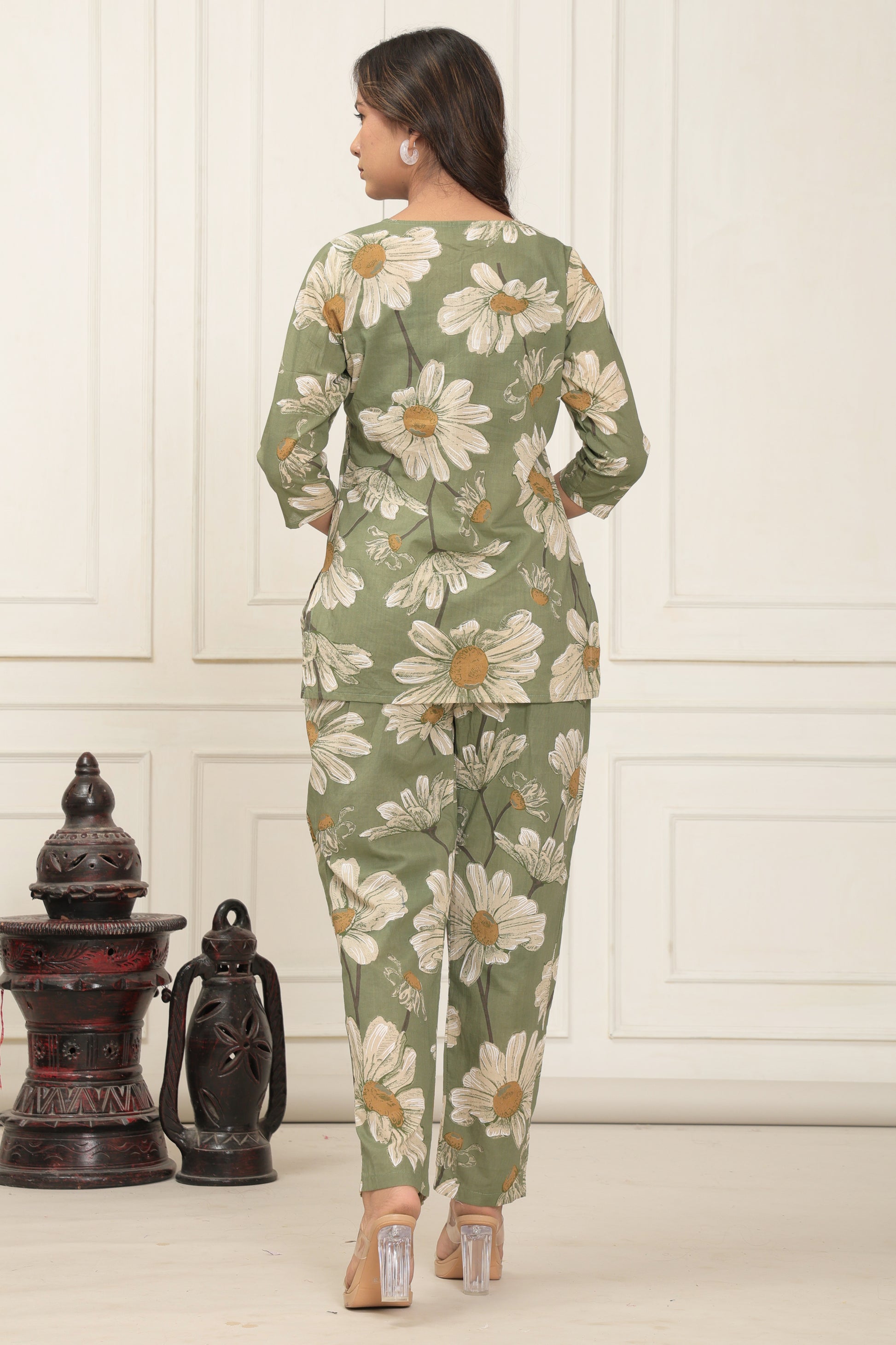 The Olive Bloom Set is crafted in soft, breathable cotton and painted in soothing olive green, sprinkled with hand-drawn-style daisy florals that feel like a stroll through a blooming garden. The top features a flattering straight silhouette with a keyhole neckline and relaxed 3/4th sleeves, designed to keep you at ease all day long.