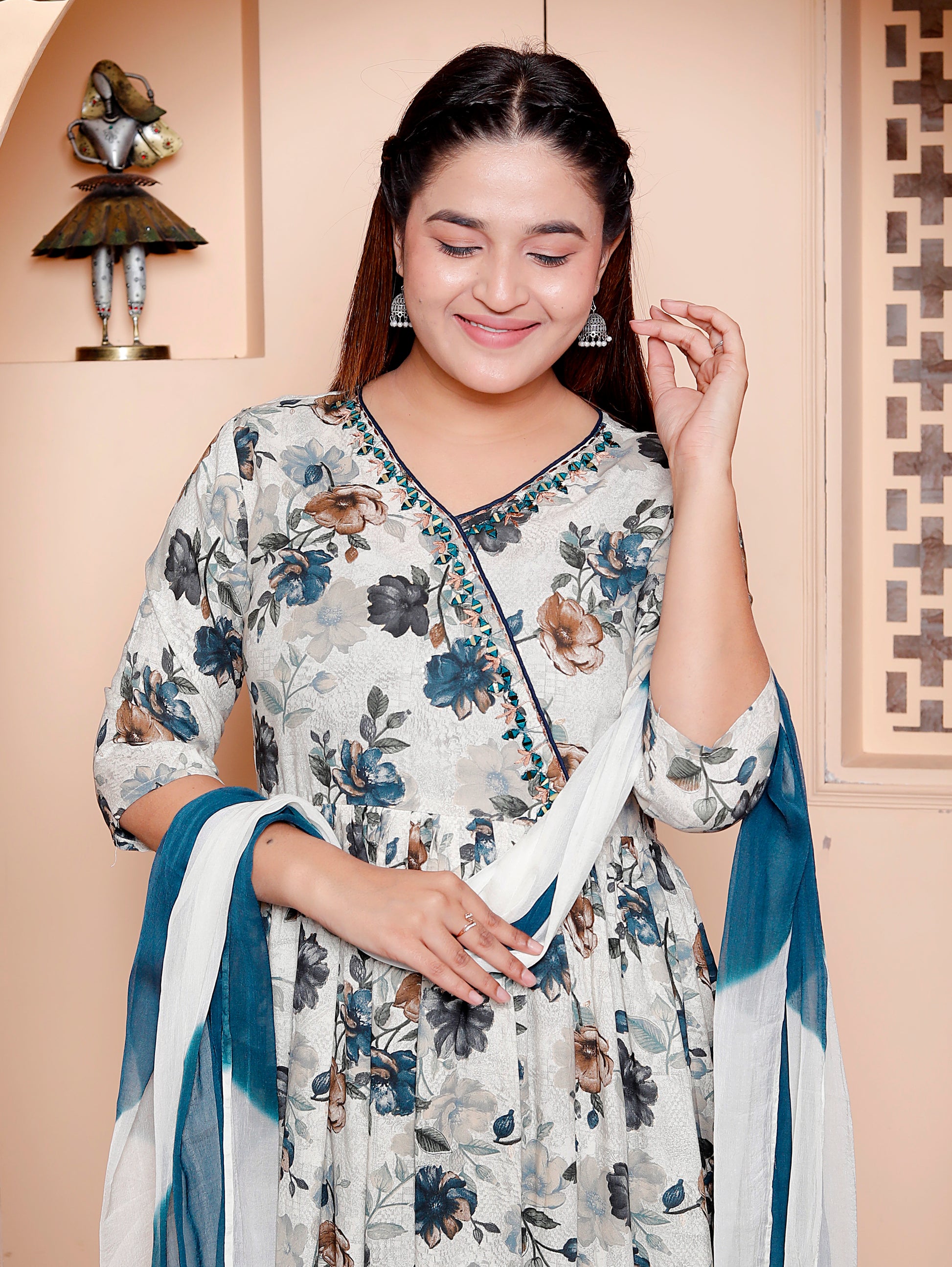 Rayon Floral Print Angrakha Anarkali Kurta Set with Dupatta & Solid Pants