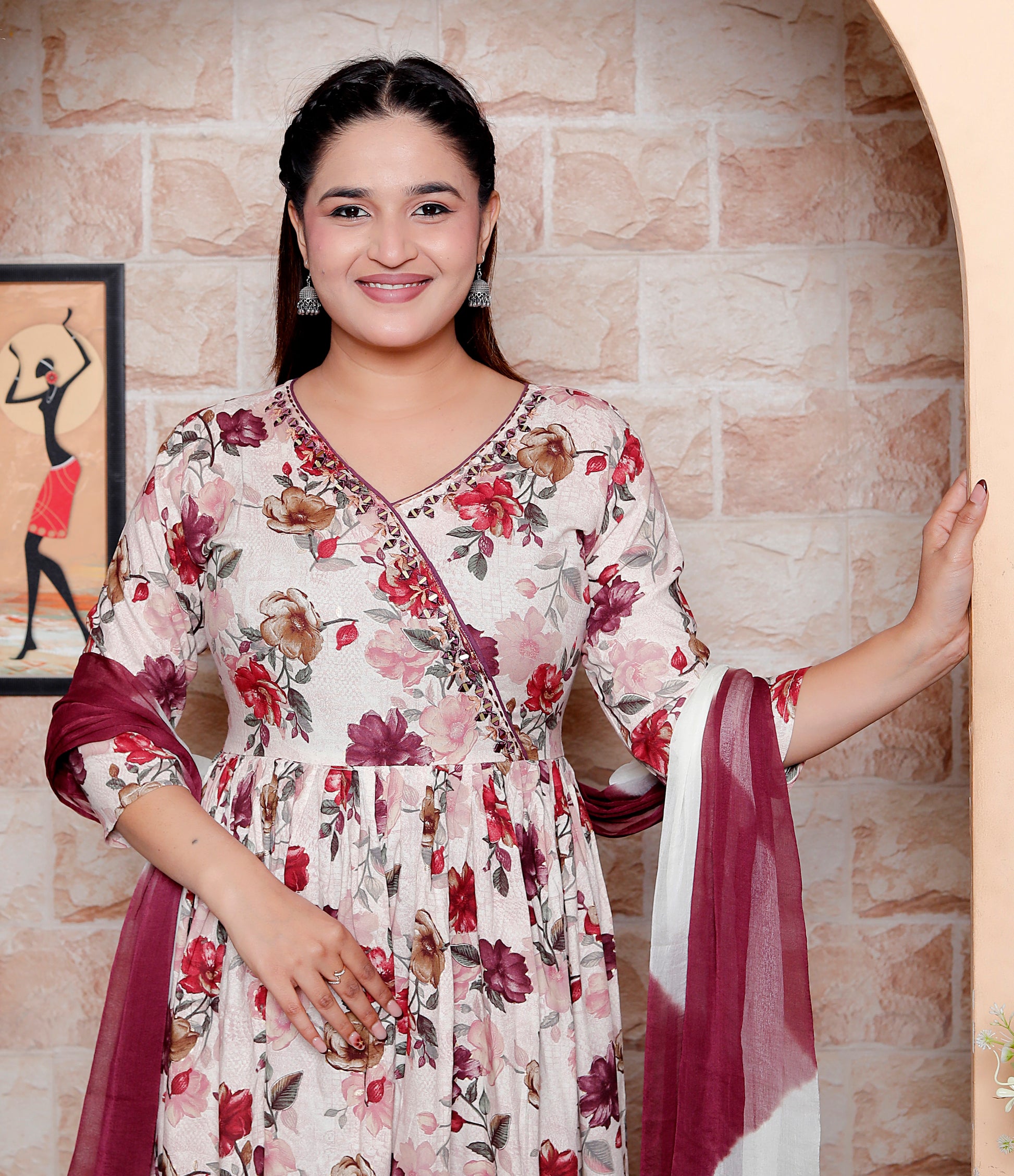 Rayon Maroon Floral Print Anarkali Kurta Set with Dupatta & Solid Pants