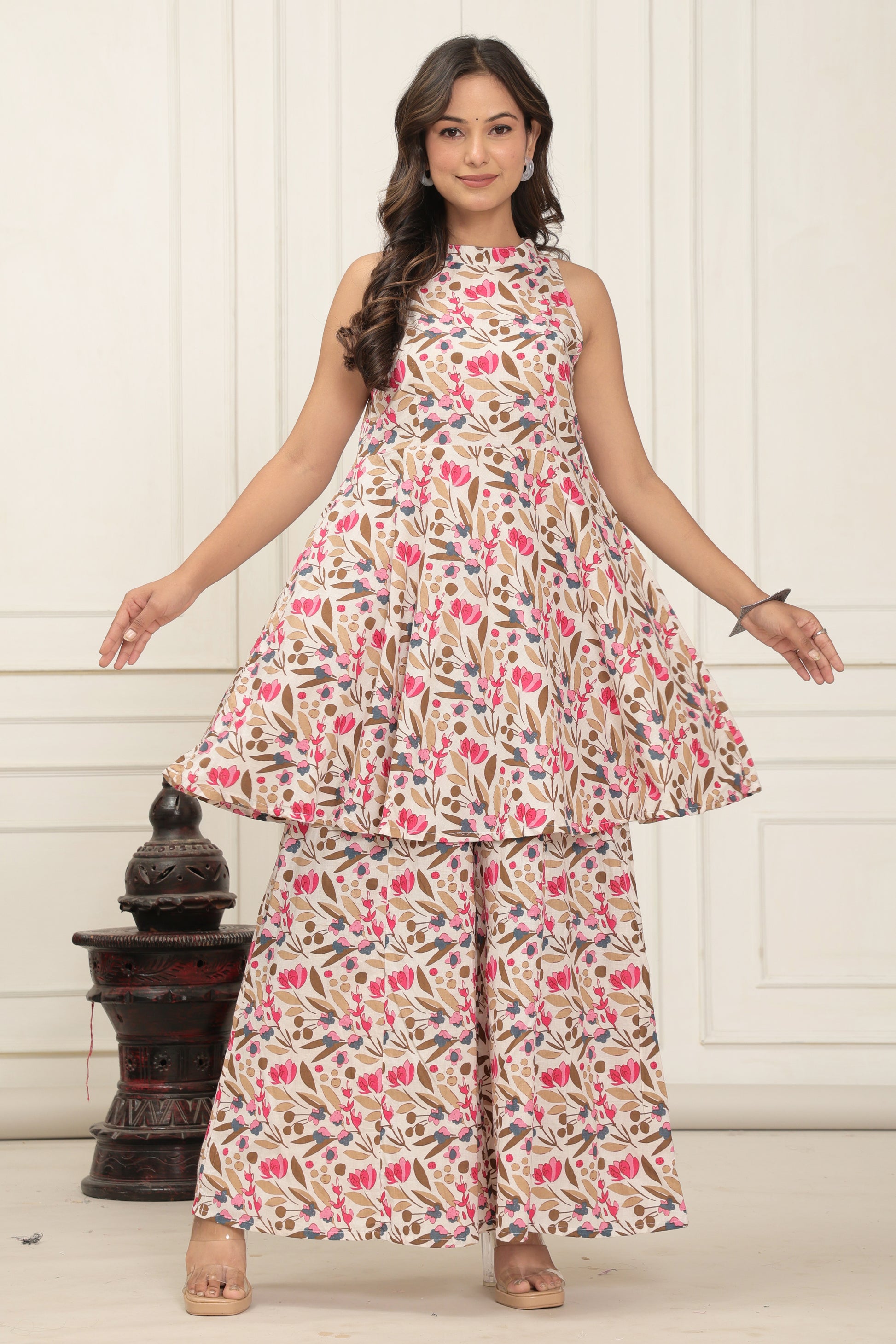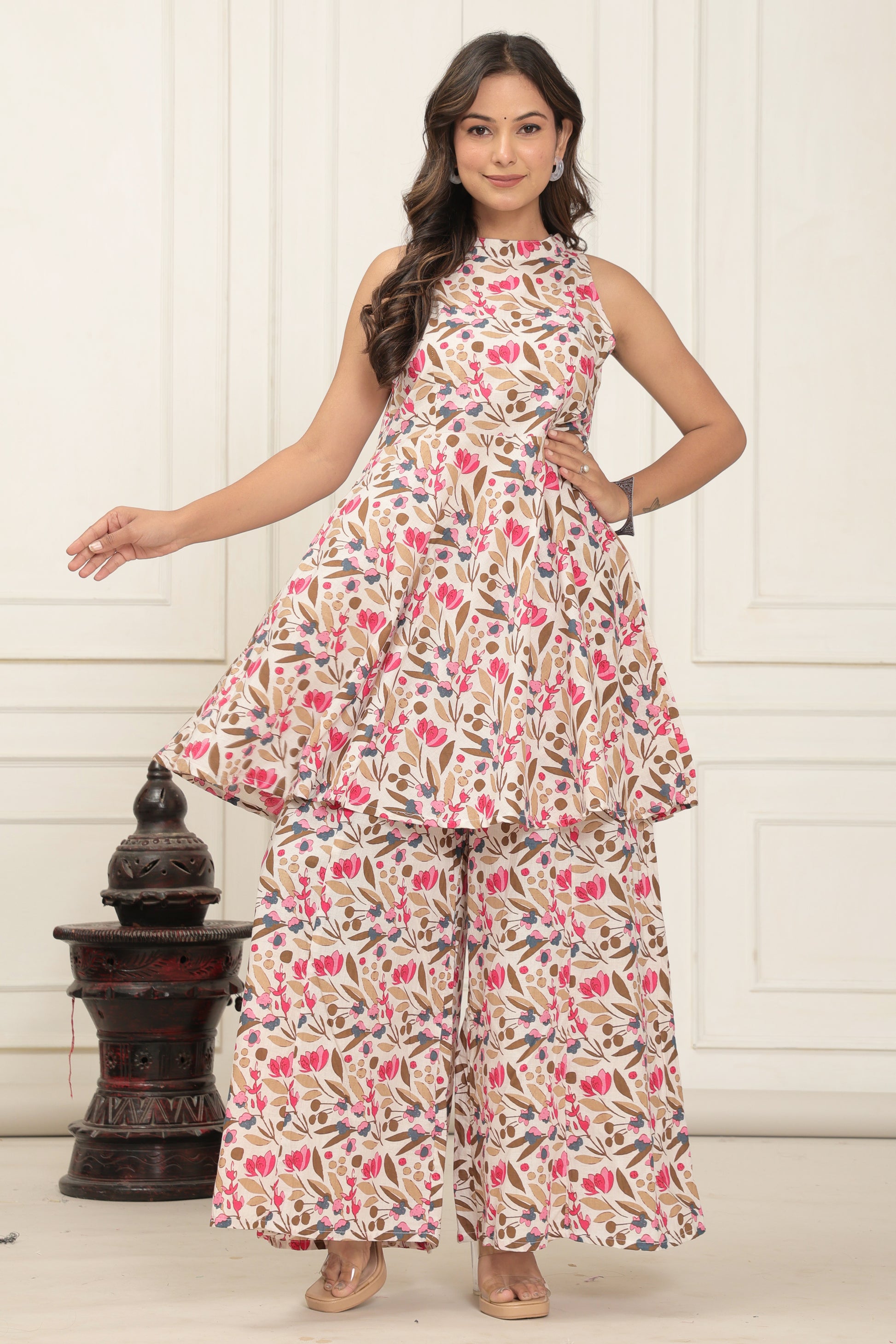 Verdora – Elegant Leaf Print Sleeveless Co-ord Set (Pink)