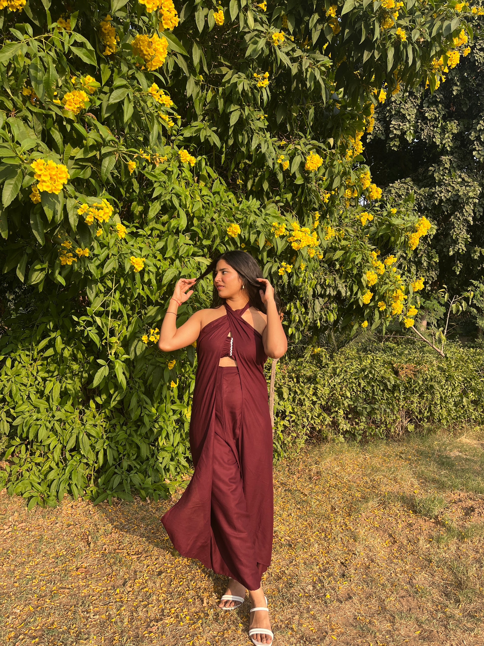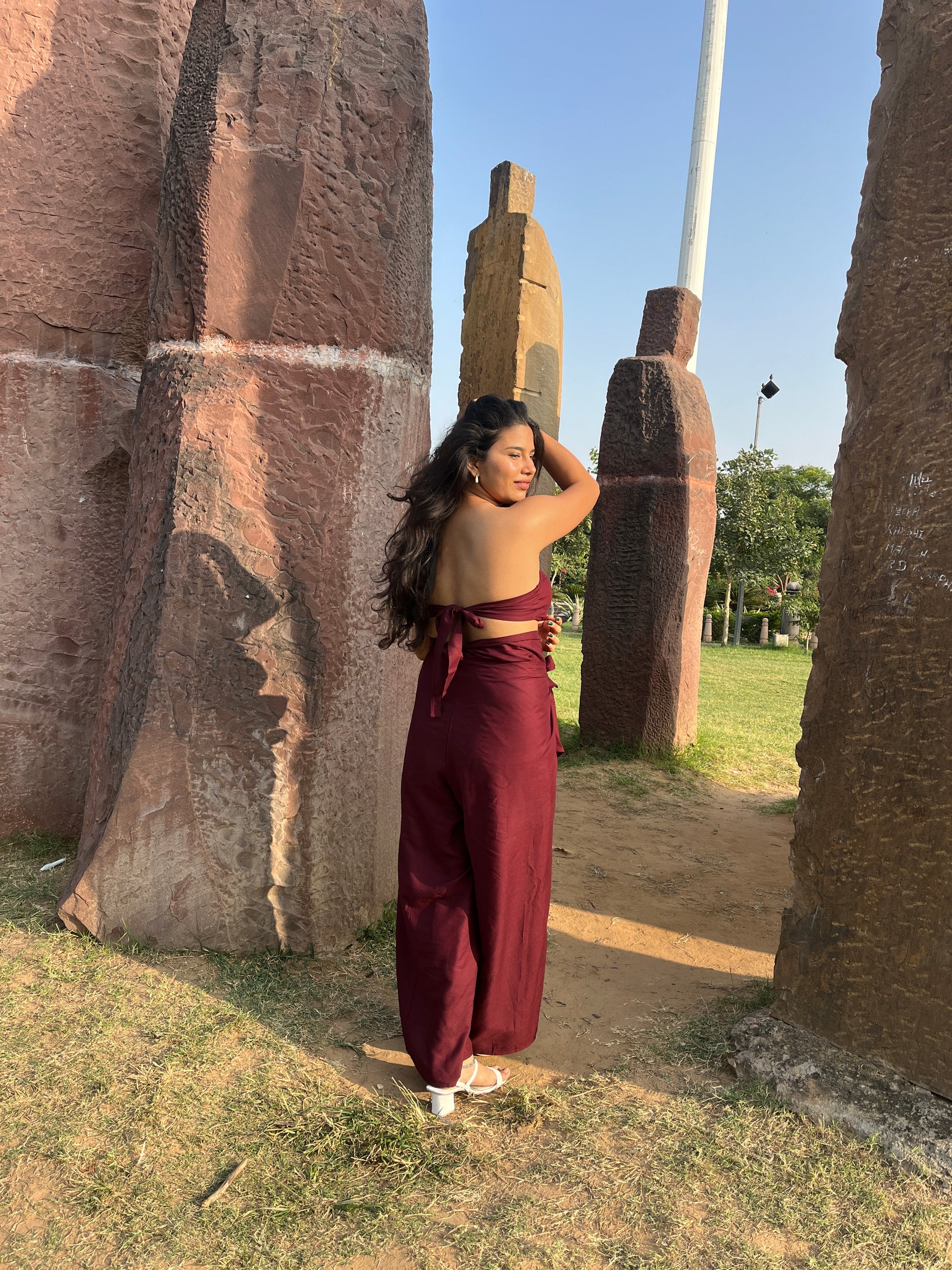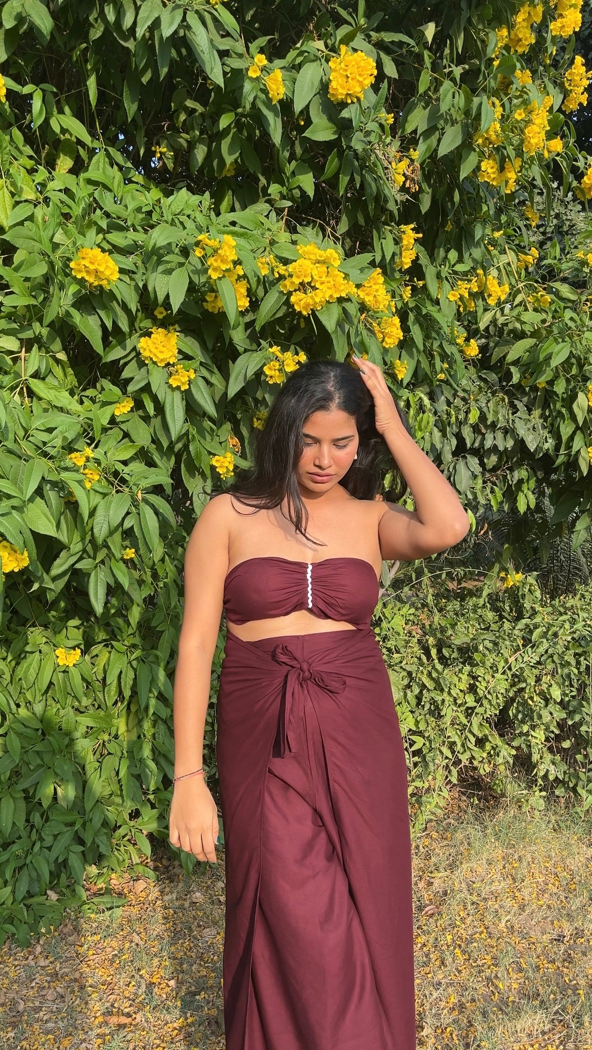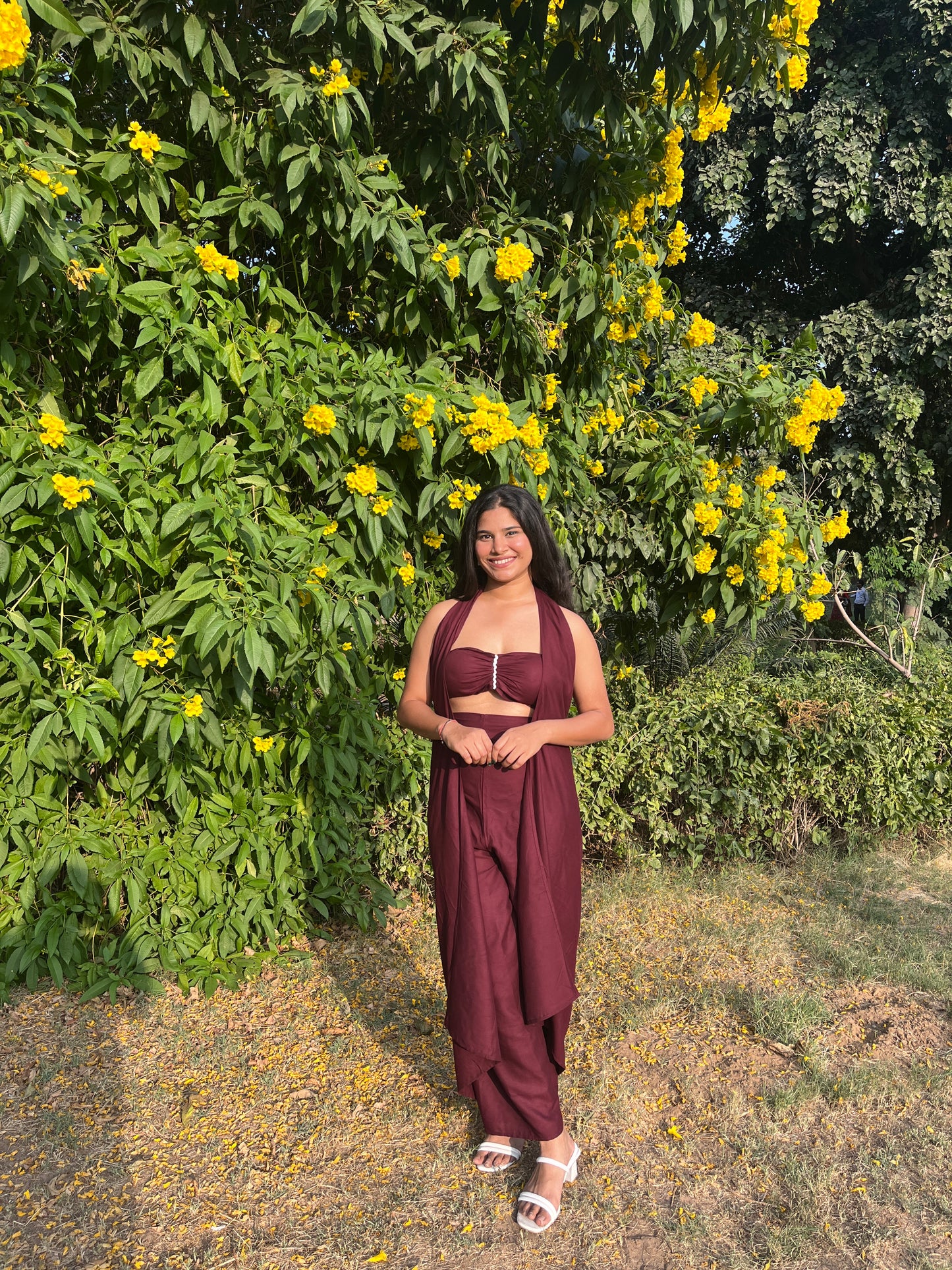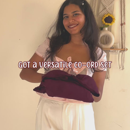 Introducing our versatile wine-colored co-ord set, crafted from soft and breathable solid rayon fabric. The top features a stylish bralette design that offers a chic and flattering fit, while the matching bottom can be styled in multiple ways to suit your mood and occasion. Whether you prefer a laid-back look or a more elevated style, this co-ord set is perfect for creating various outfits, making it a must-have addition to your wardrobe. Comfortable, elegant, and endlessly adaptable, this set effortlessly transitions from casual to evening wear with ease.