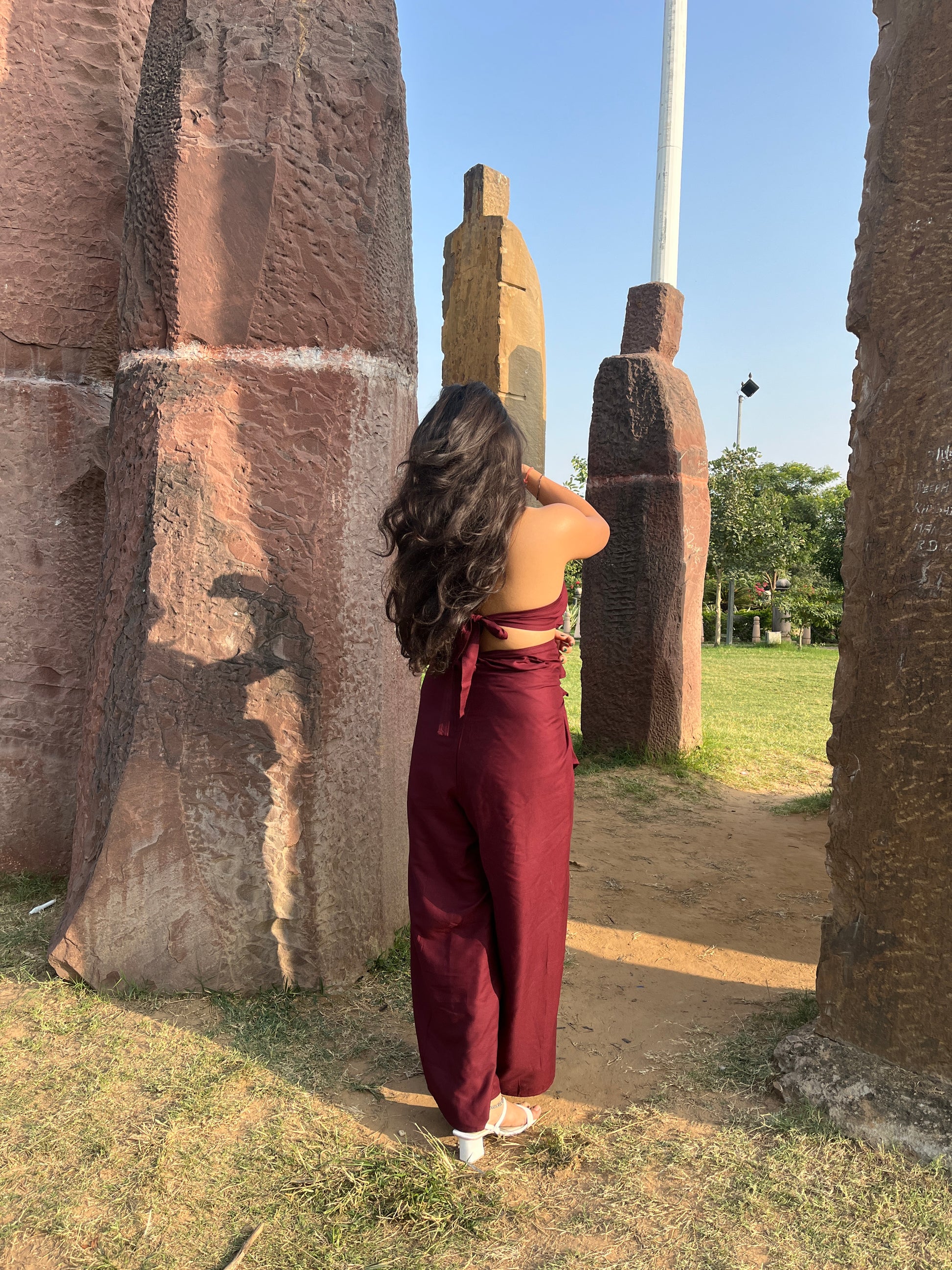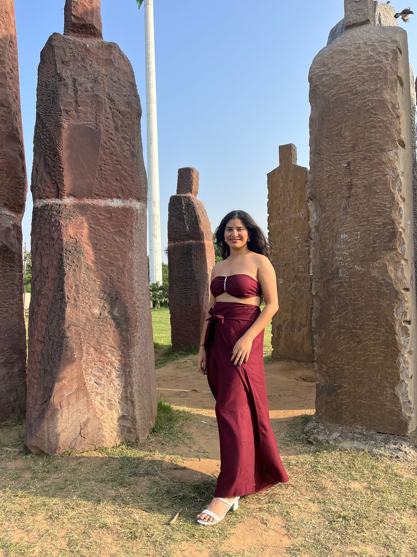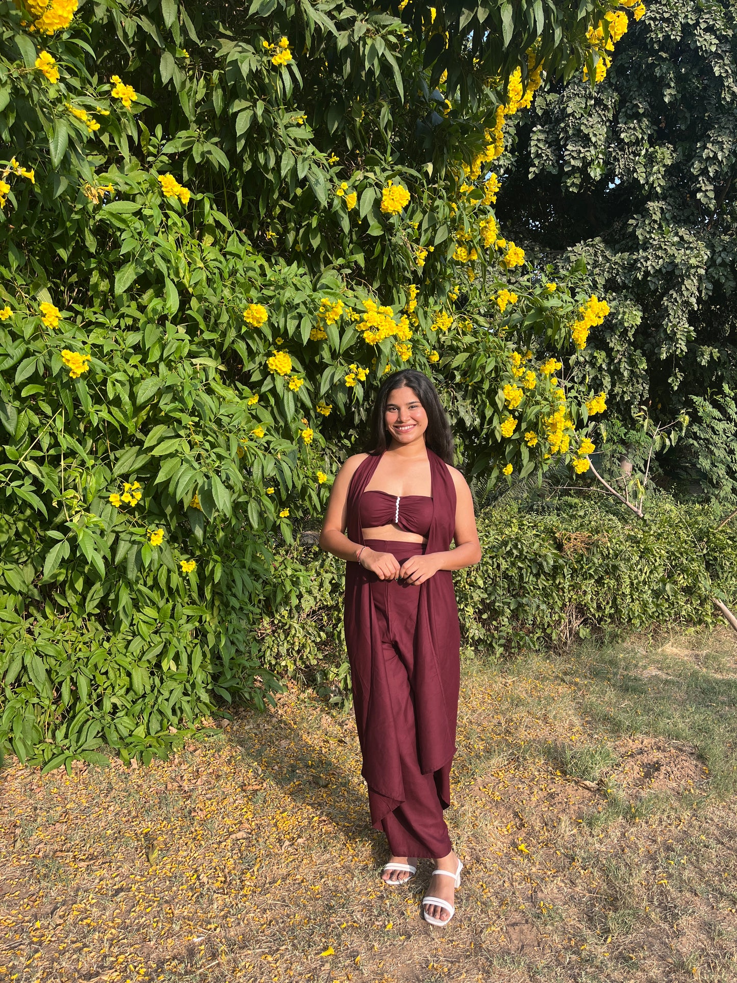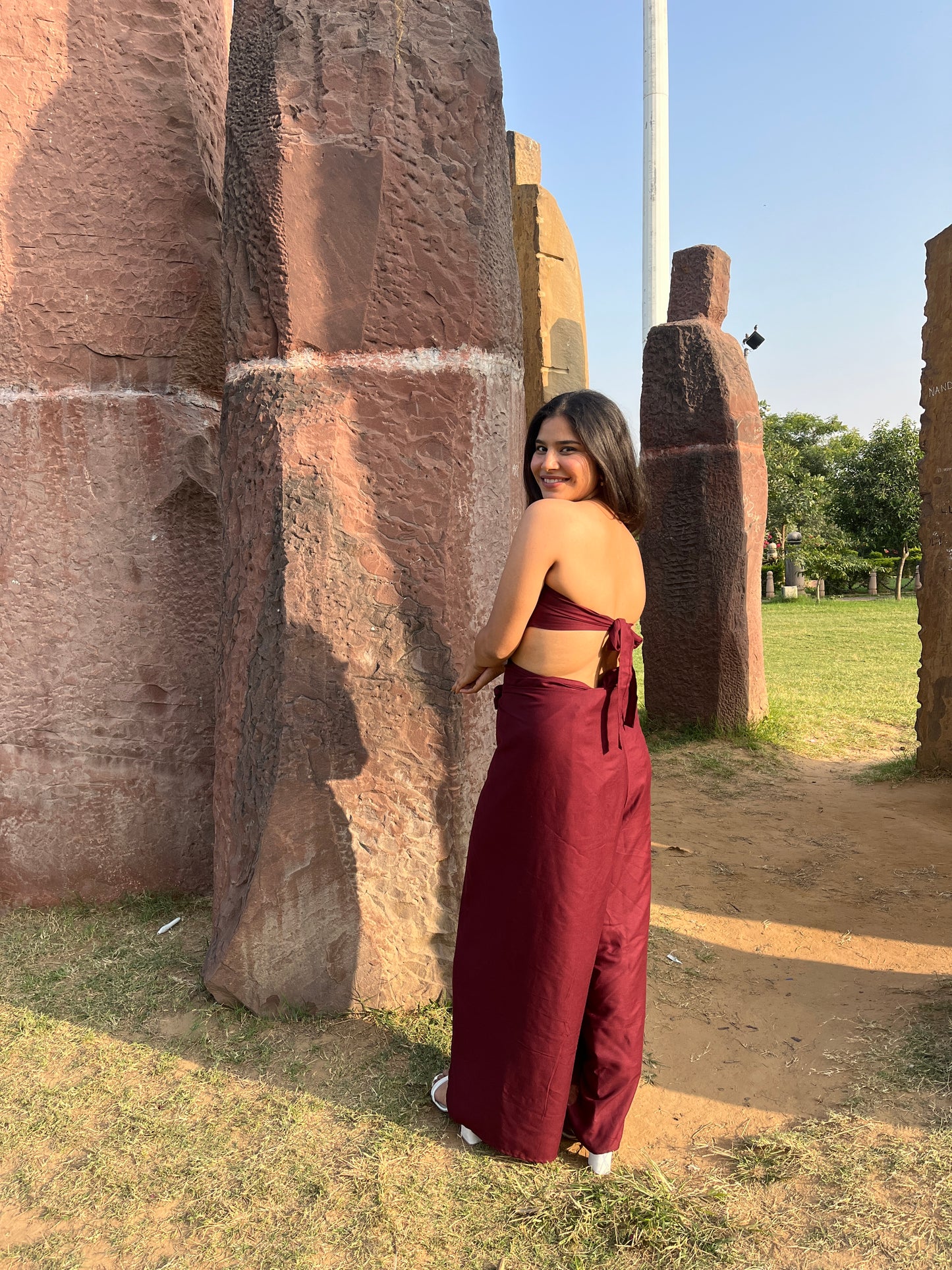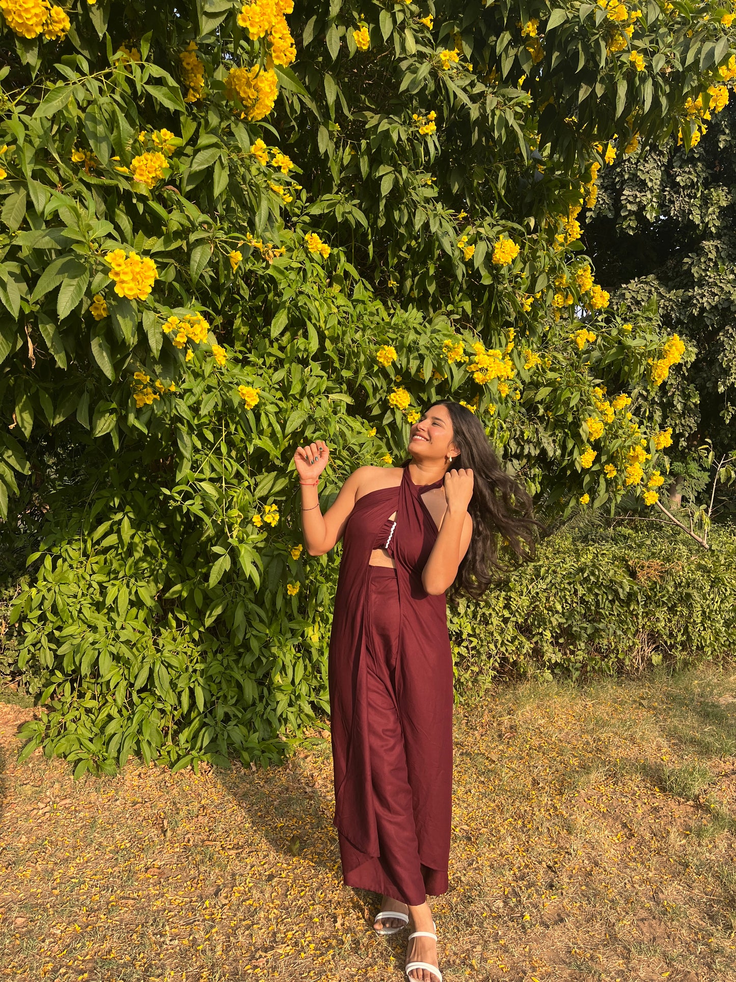 Introducing our versatile wine-colored co-ord set, crafted from soft and breathable solid rayon fabric. The top features a stylish bralette design that offers a chic and flattering fit, while the matching bottom can be styled in multiple ways to suit your mood and occasion. Whether you prefer a laid-back look or a more elevated style, this co-ord set is perfect for creating various outfits, making it a must-have addition to your wardrobe. Comfortable, elegant, and endlessly adaptable, this set effortlessly transitions from casual to evening wear with ease.