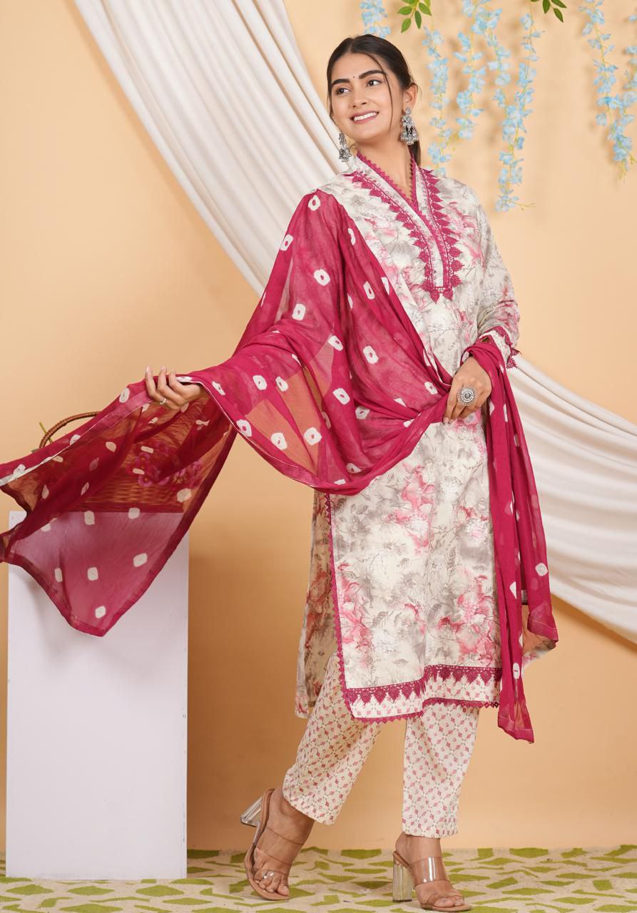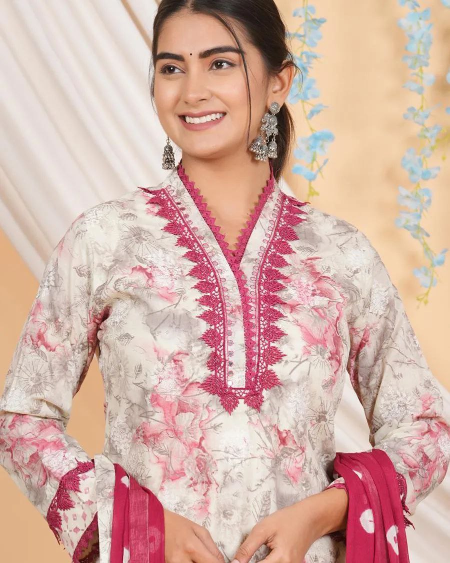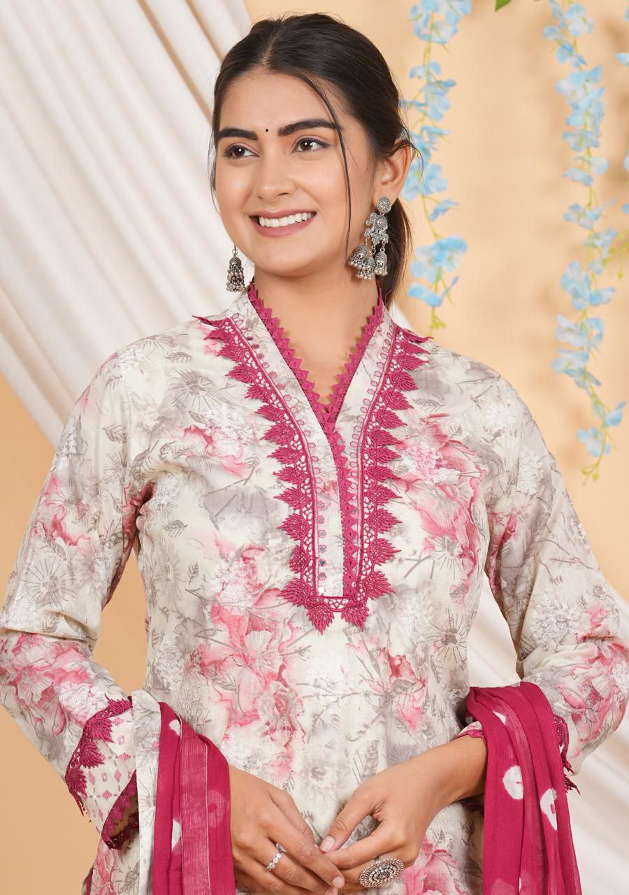 Style: Kurta with lace on neck and sleeves, Pant and Chiffon Dupatta