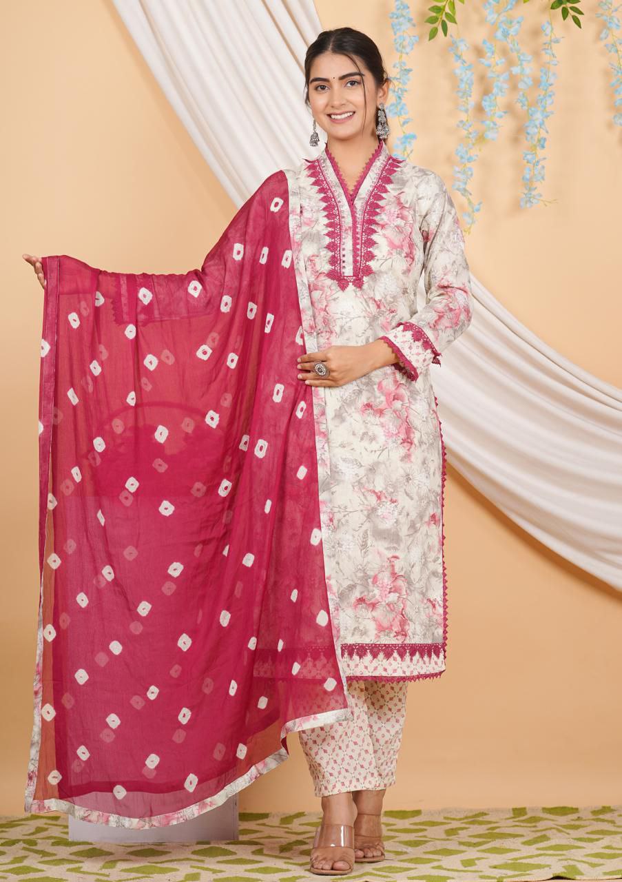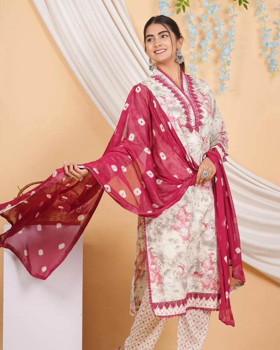 Women's Cotton V-Neck Printed Suit Set with Chiffon Dupatta (Maroon)