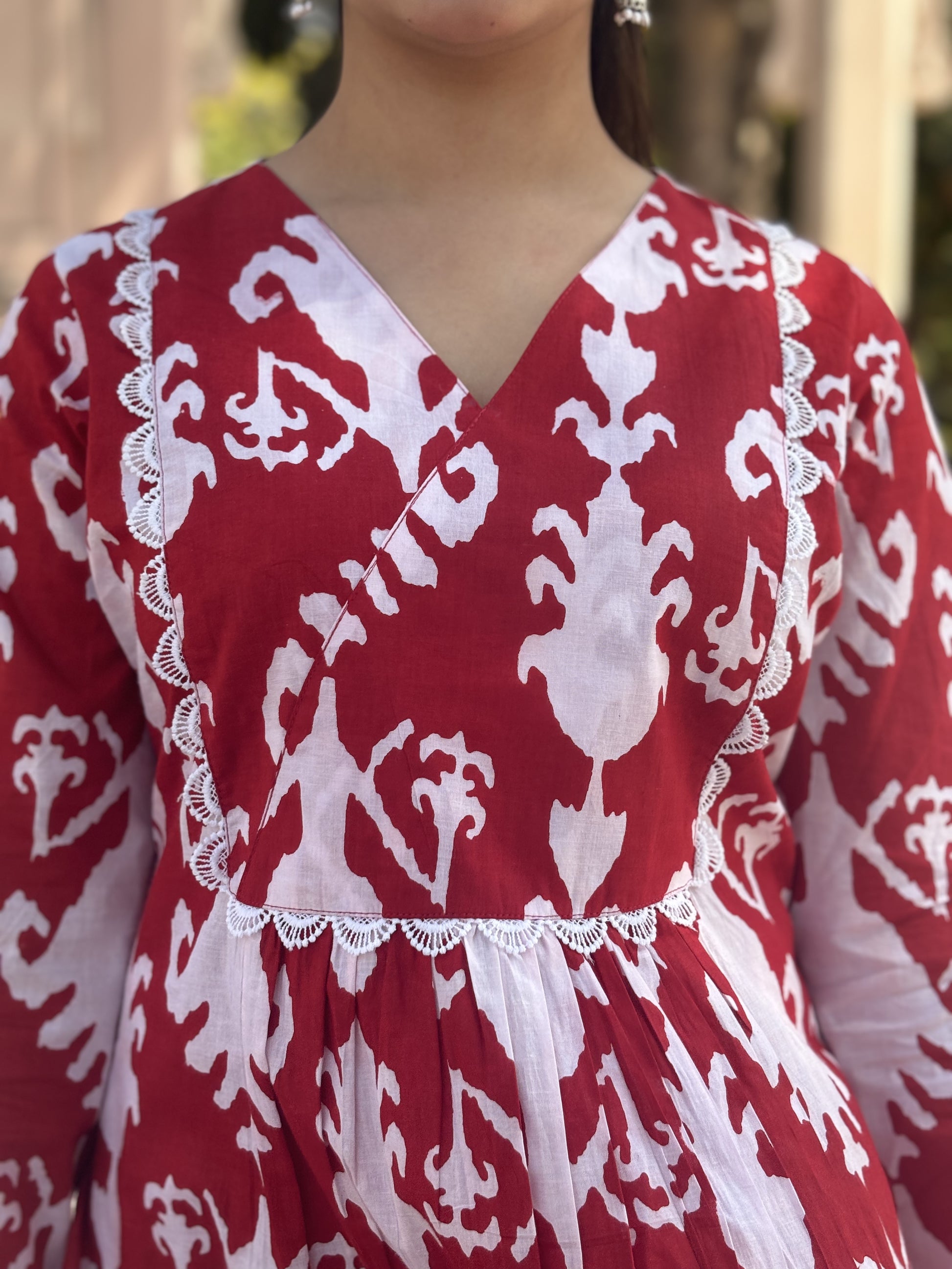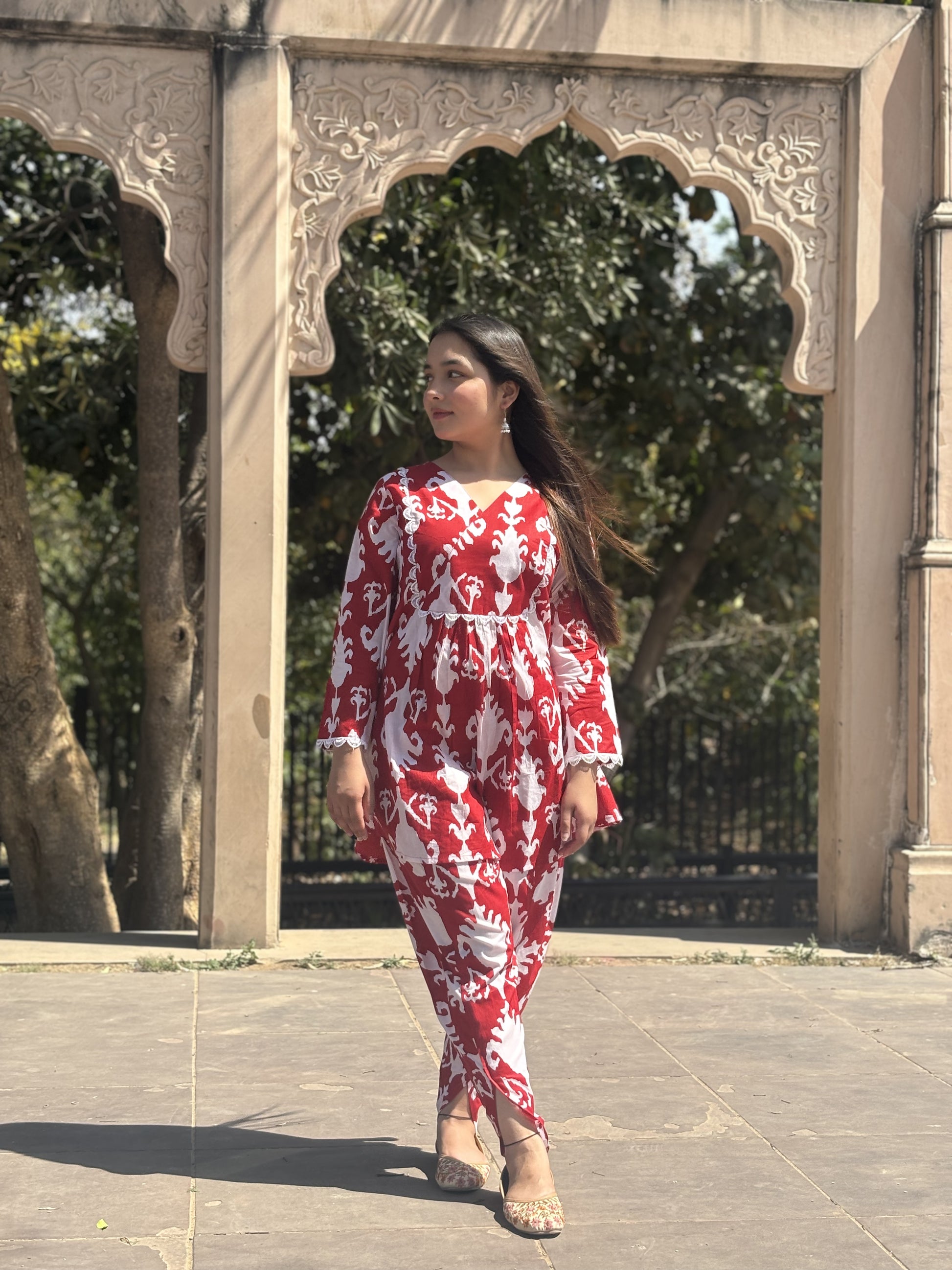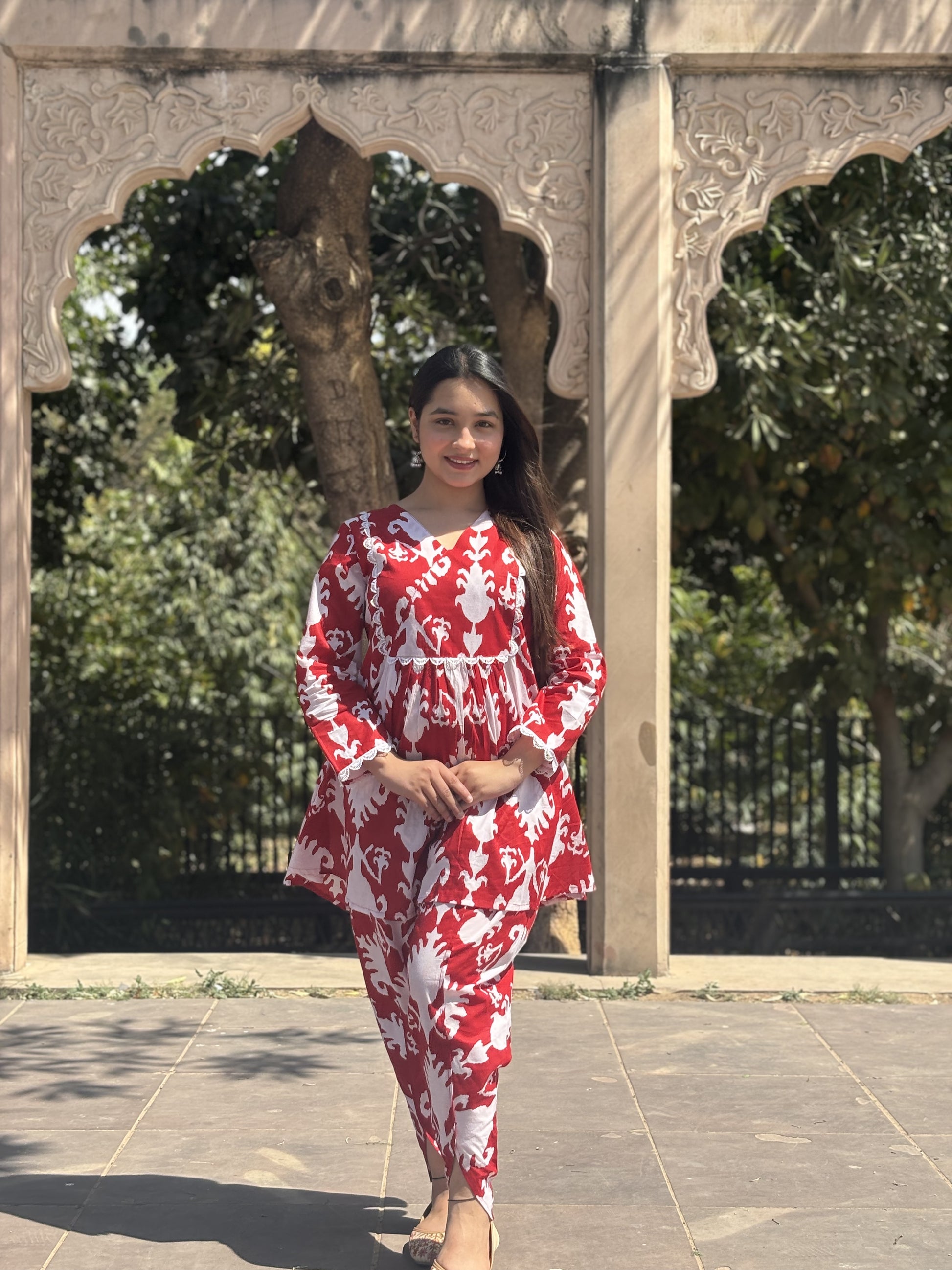 Crafted in airy cotton cambric, this pastel beauty blends everyday comfort with subtle elegance. Whether you're heading to work, stepping out for brunch, or just feeling cute at home – this kurta set soft lace detailing and flowy fit make sure you look put together without trying too hard.