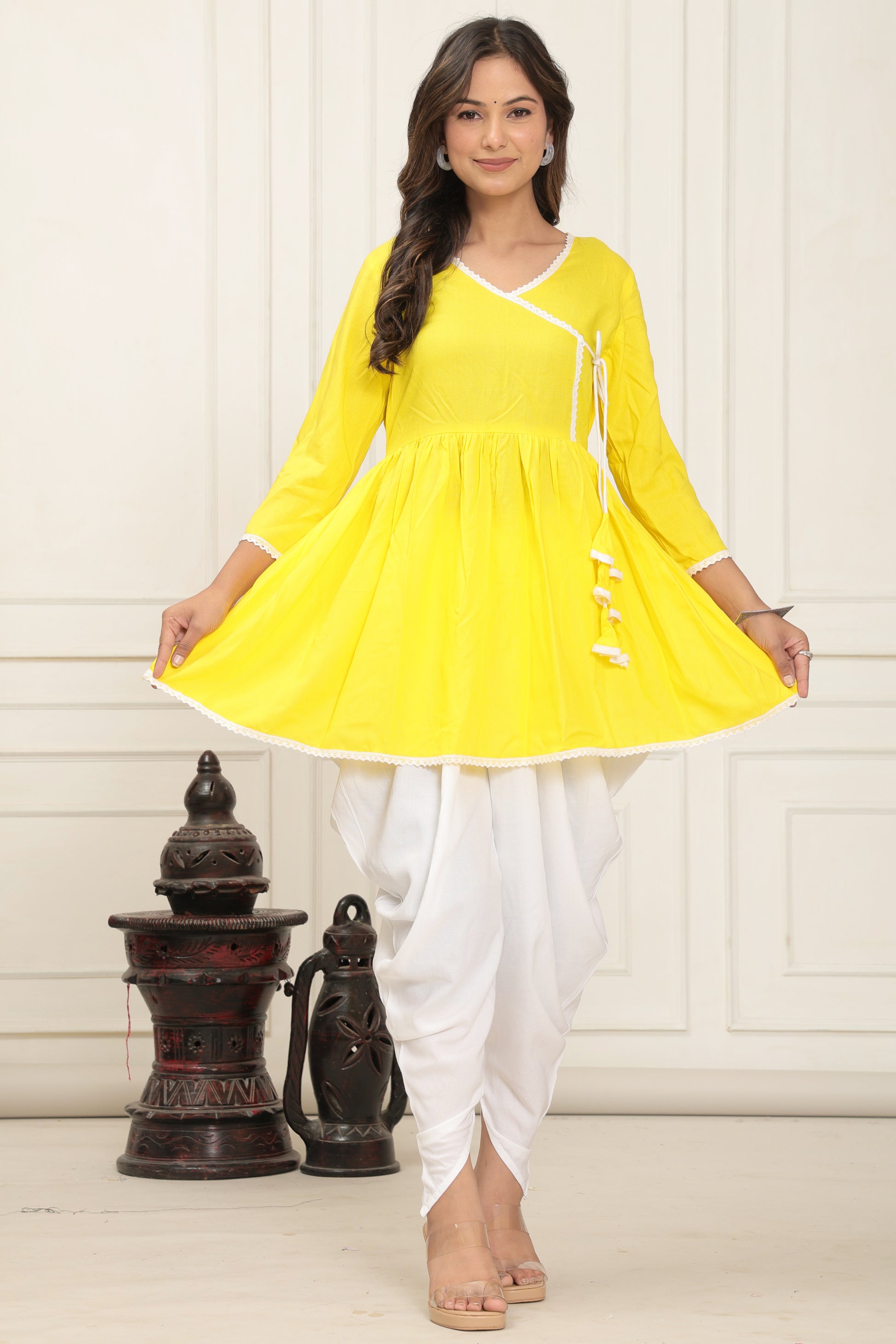 Add a splash of sunshine to your wardrobe with this vibrant bright yellow angrakha-style short kurti paired with elegant white dhoti pants. Designed for the modern Indian woman who values comfort and tradition, this set blends ethnic charm with contemporary flair.