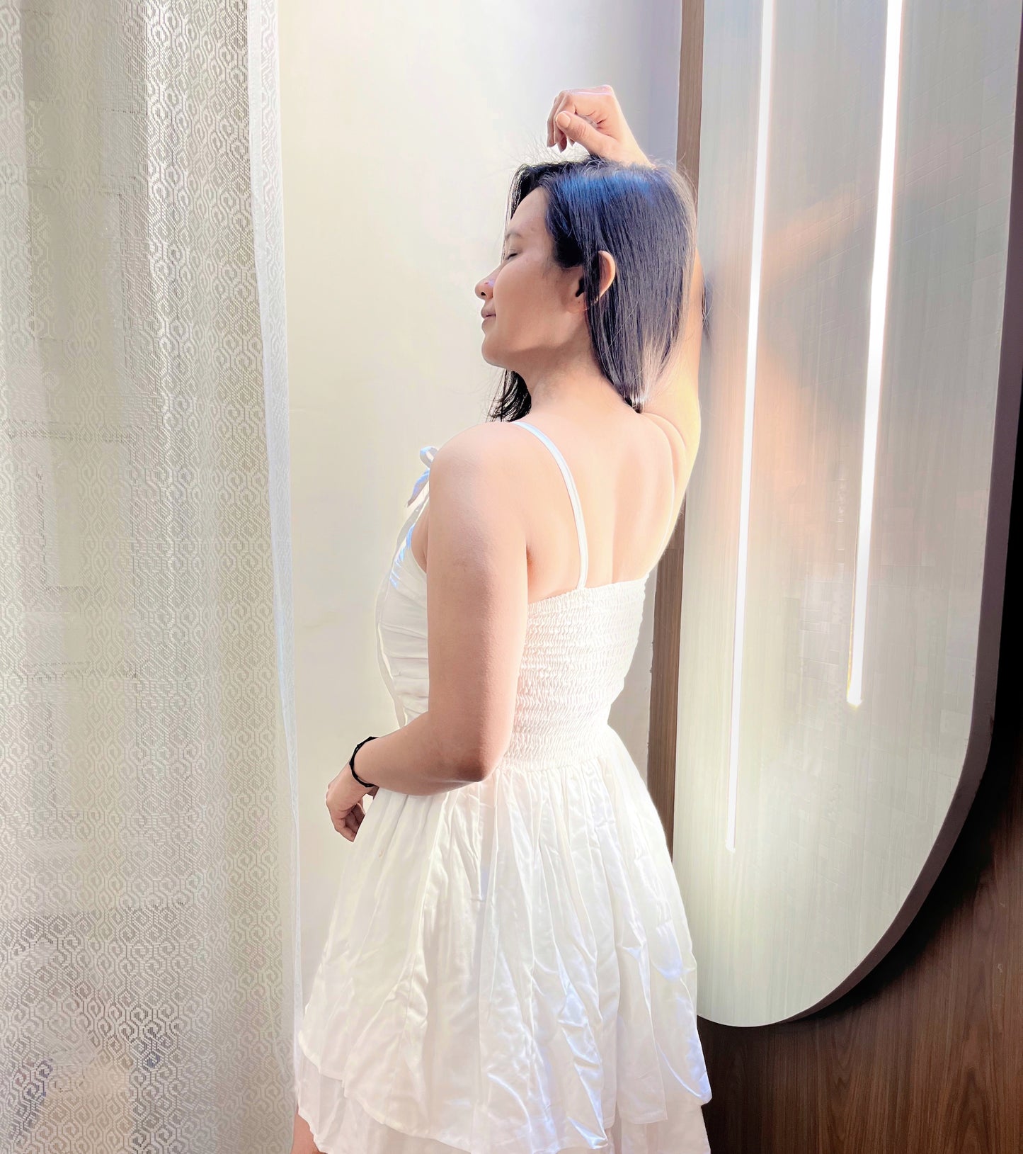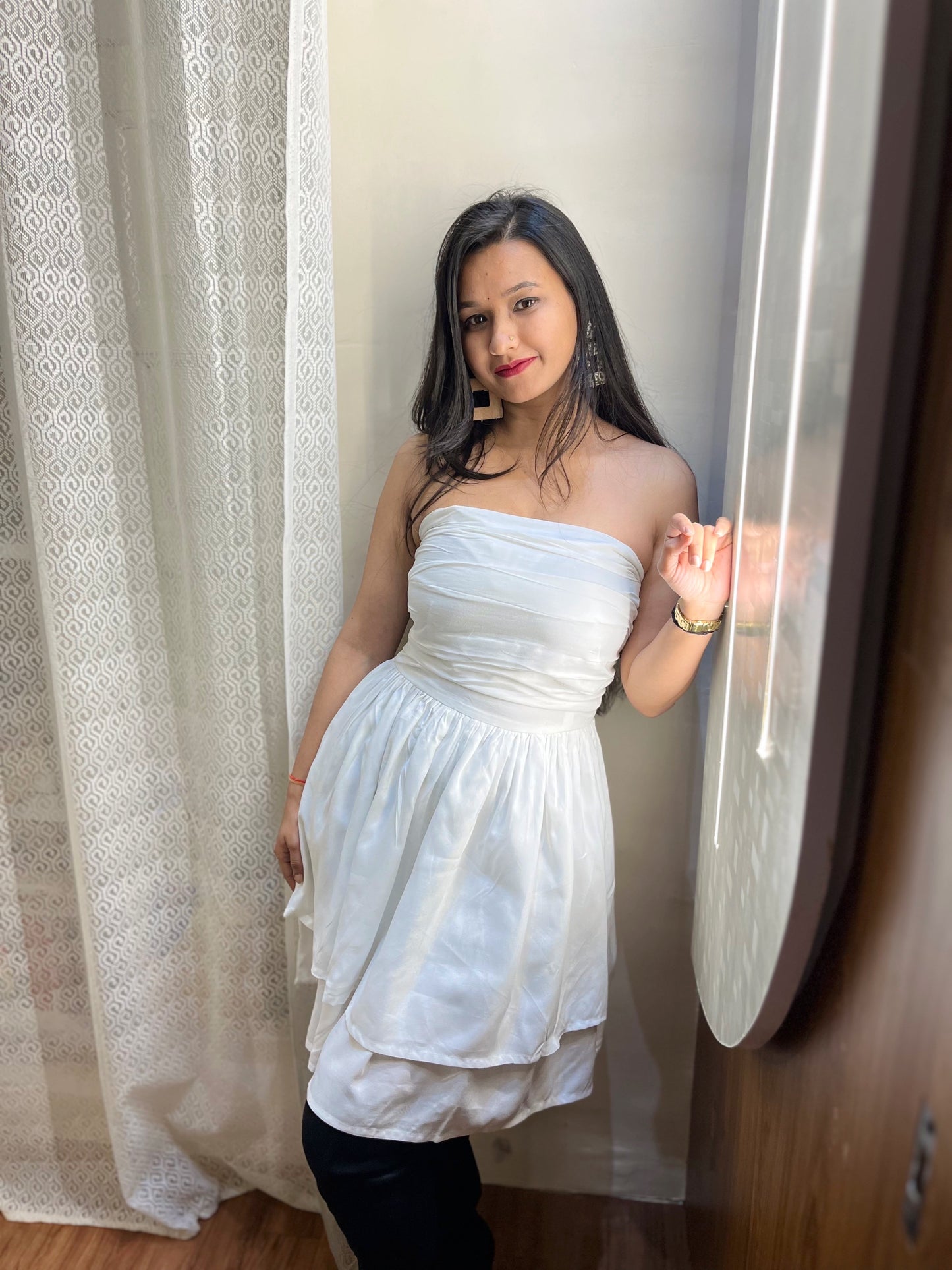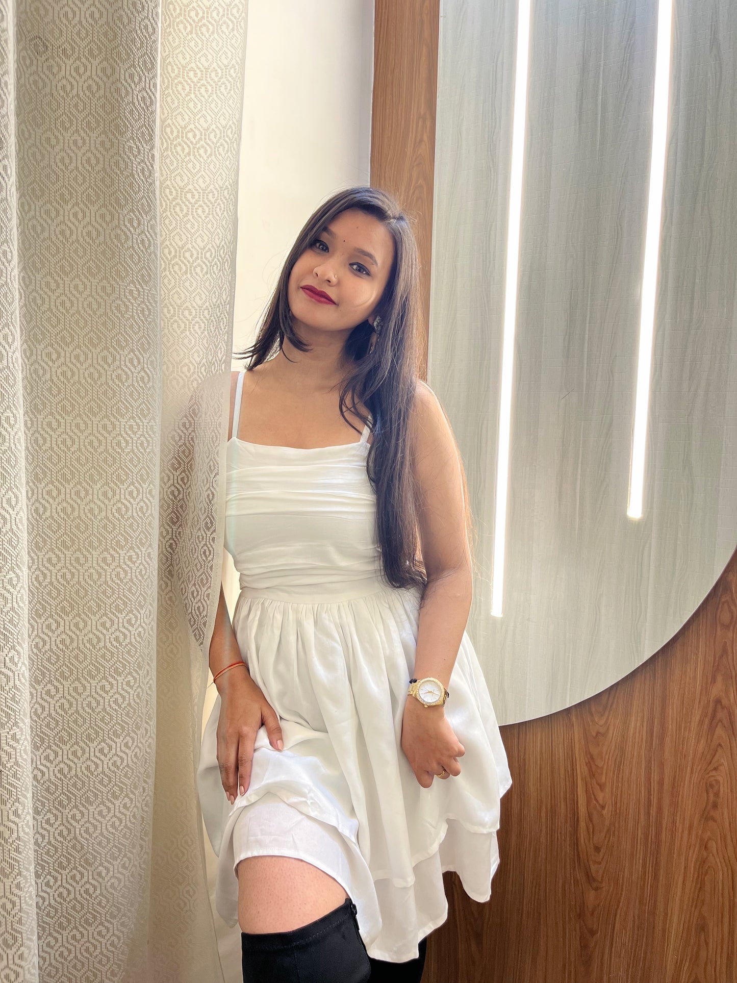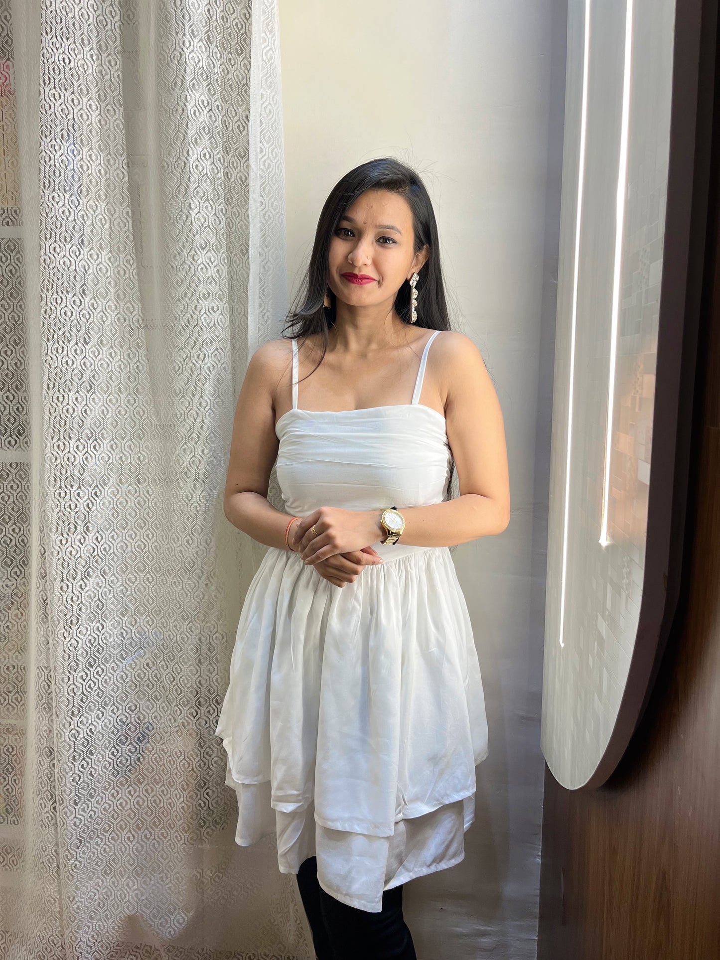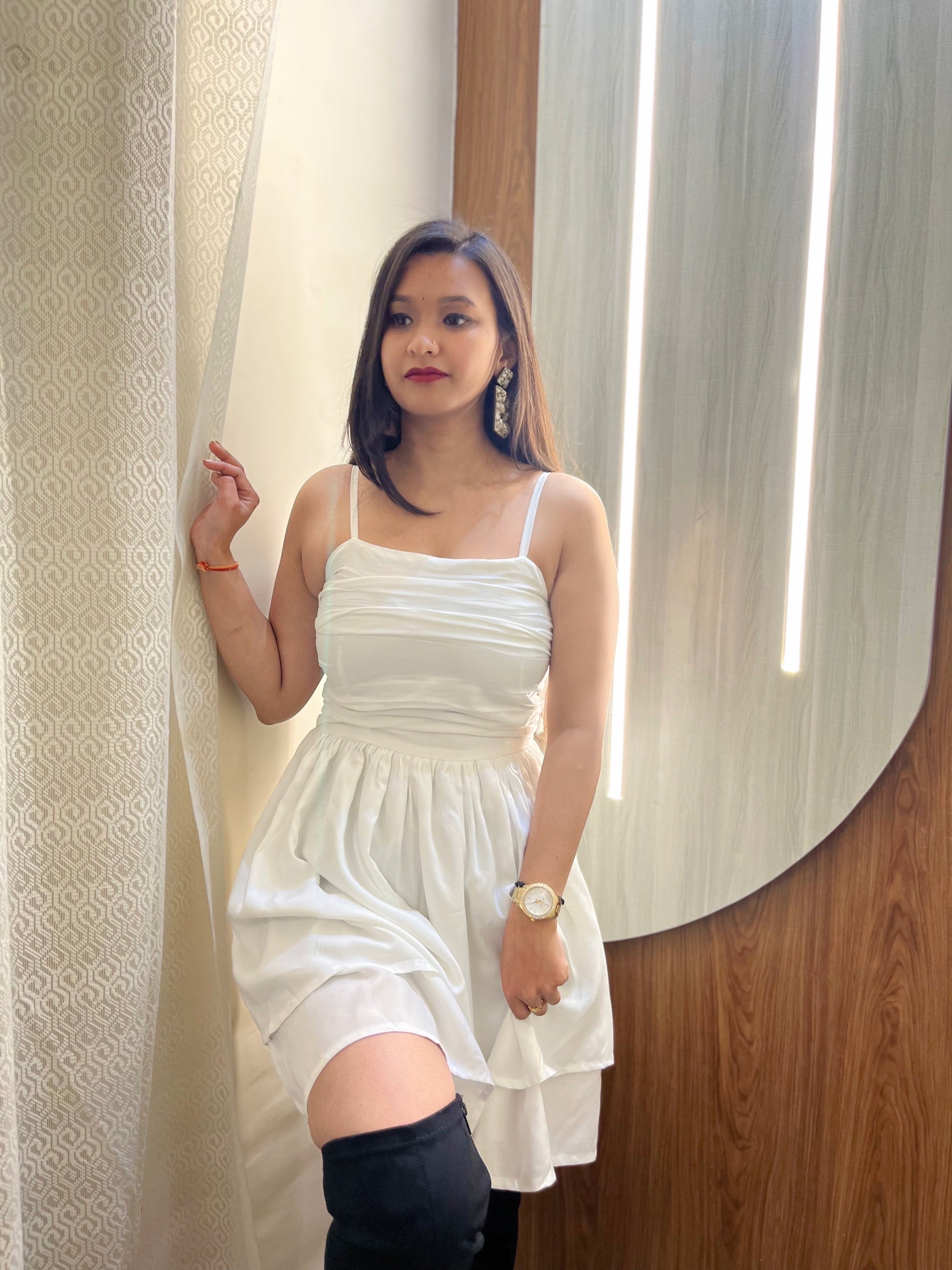 Expertly designed with precision tailoring, this solid white dress offers a flattering silhouette that accentuates the curves of a woman's body. Made with high-quality fabric, it provides both comfort and style for any occasion. It's a versatile dress that can be dressed up or down, making it a staple piece in any wardrobe. Perfect for any fashion-forward woman looking for a timeless and elegant dress.